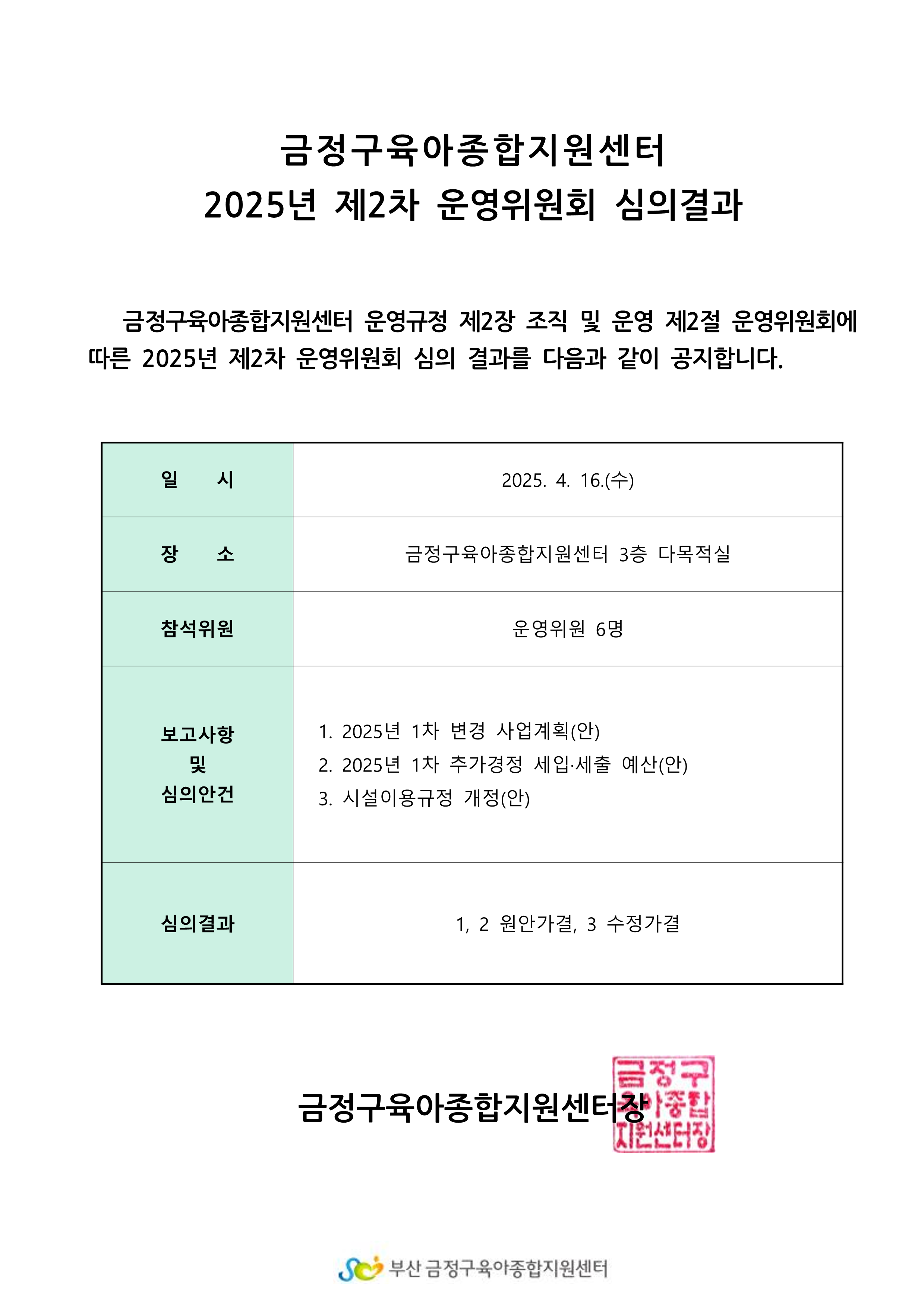 2025년도 금정구육아종합지원센터 1차 추가경정 세입·세출예산서 공고