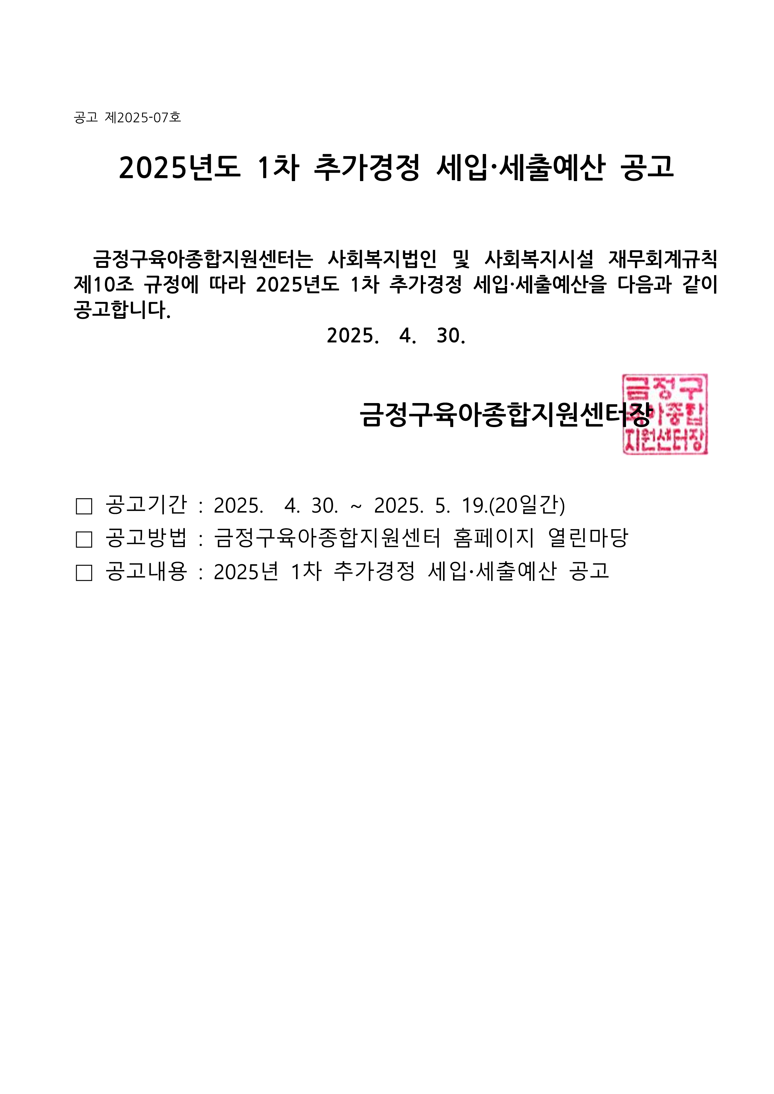 [예결산] 2025년도 금정구육아종합지원센터 1차 추가경정 세입·세출예산서 공고
