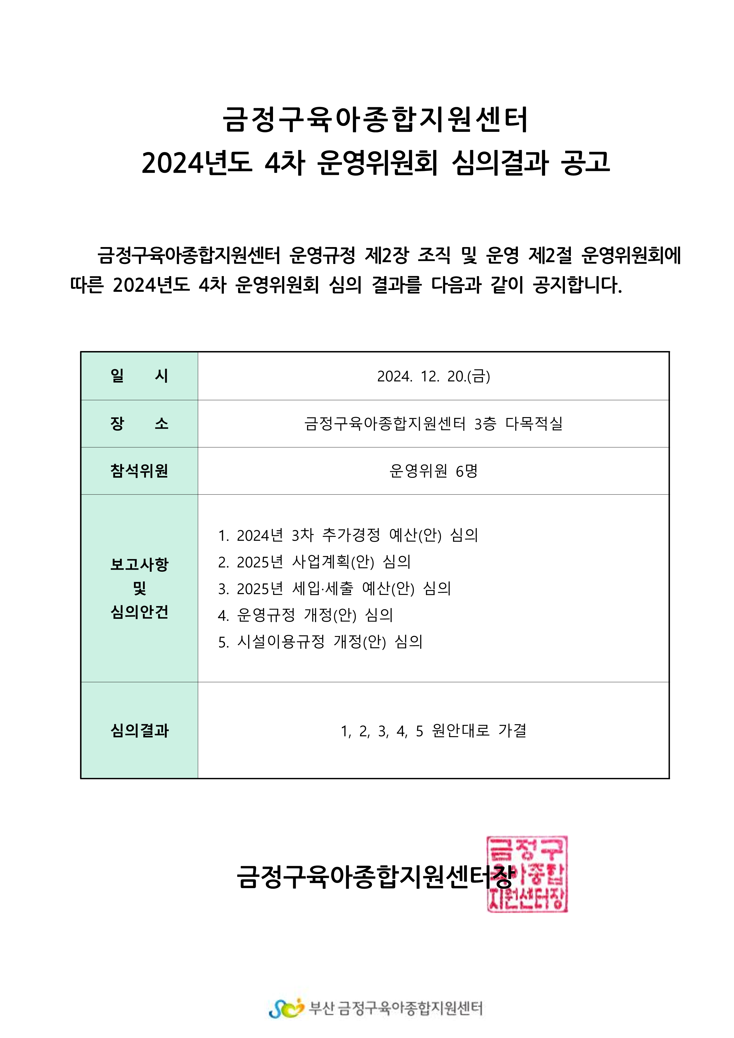 2024년도 금정구육아종합지원센터 3차 추가경정 세입·세출예산서 공고