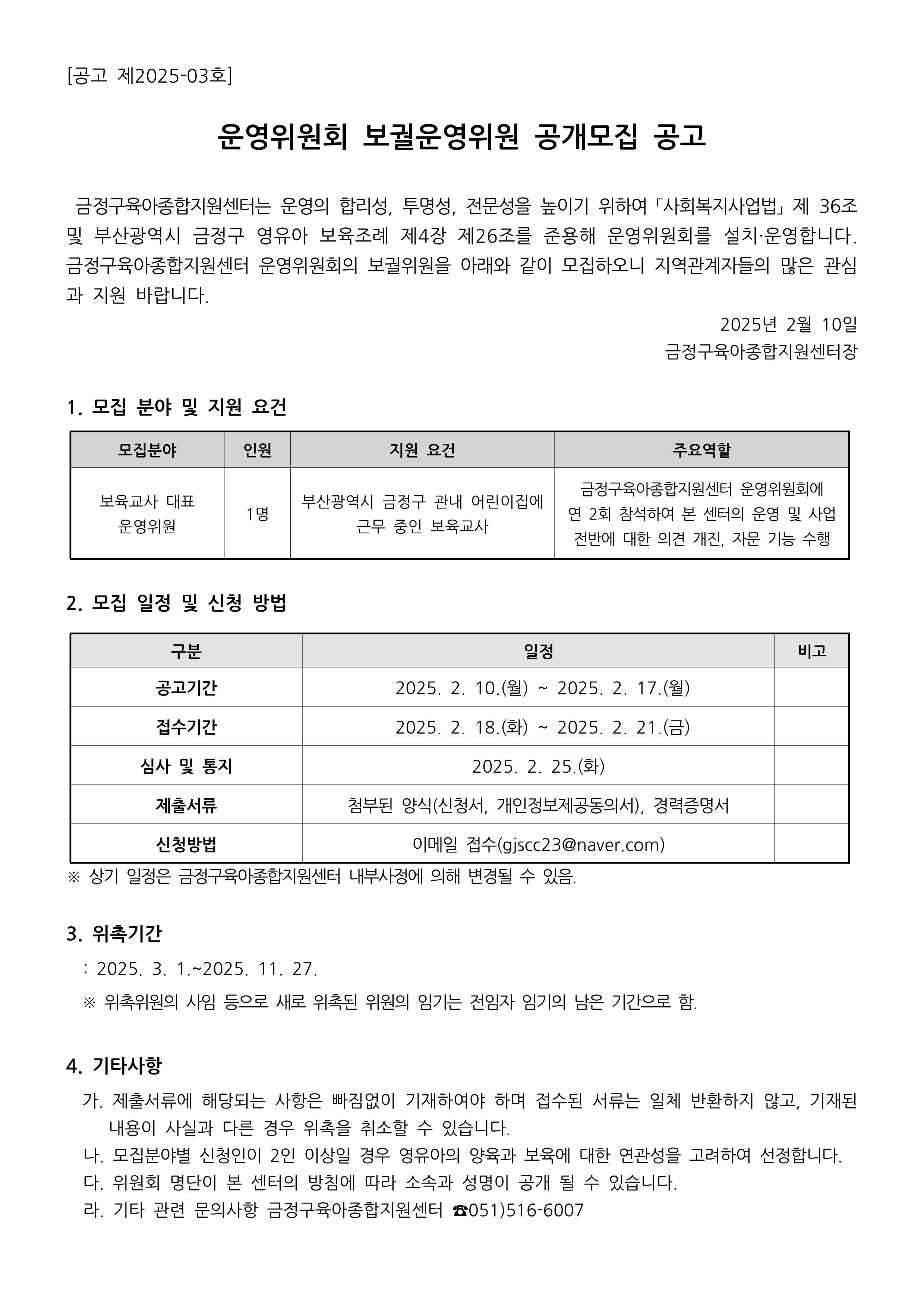 2025년 금정구육아종합지원센터 세입·세출예산서 공고