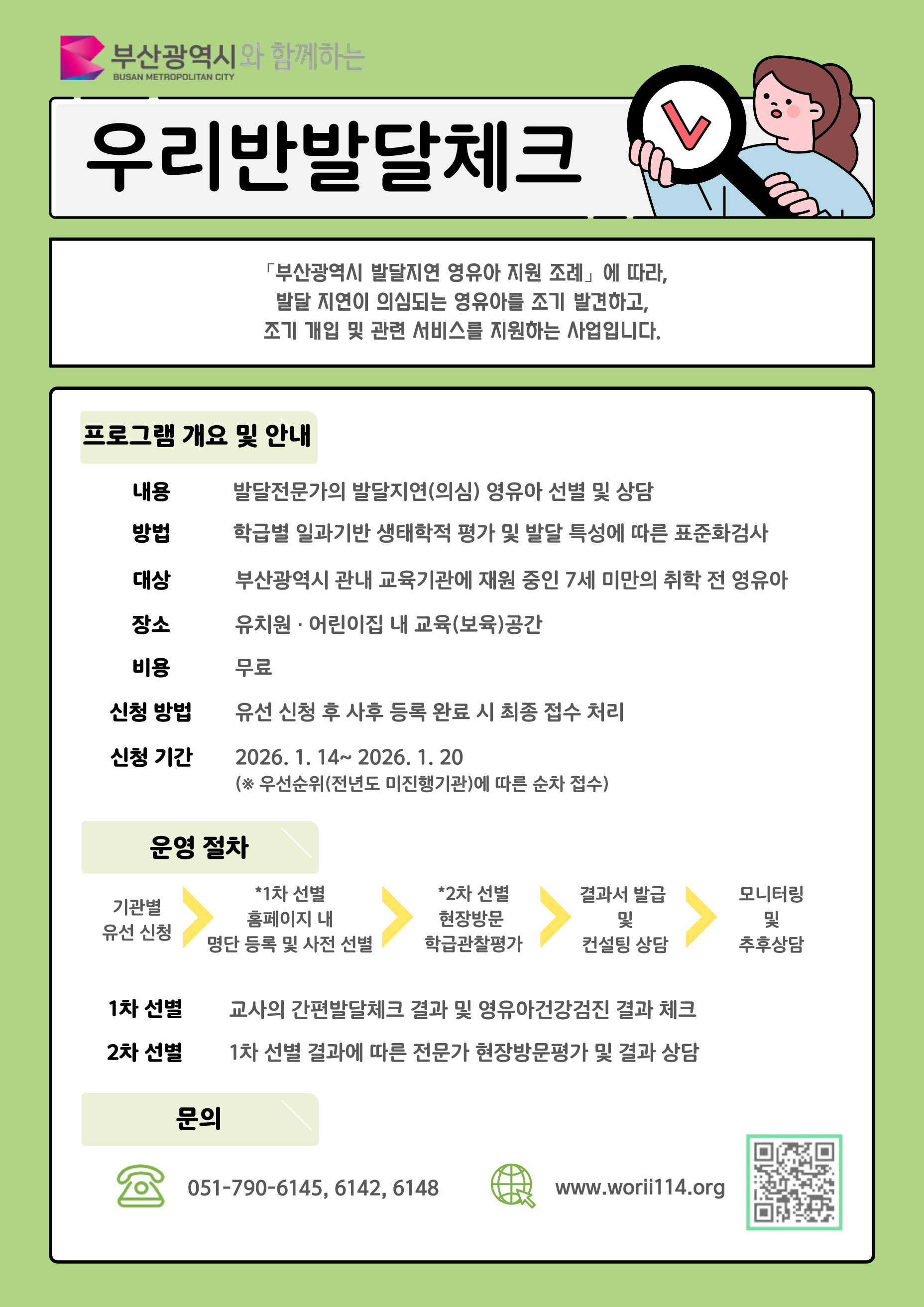 「부산광역시 발달지연 영유아 지원 조례」에 따라, 발달 지연이 의심되는 영유아를 조기 발견하고 조기 개입 및 관련 서비스를 지원하는 <우리반 발달 체크> 프로그램을 안내해드립니다.