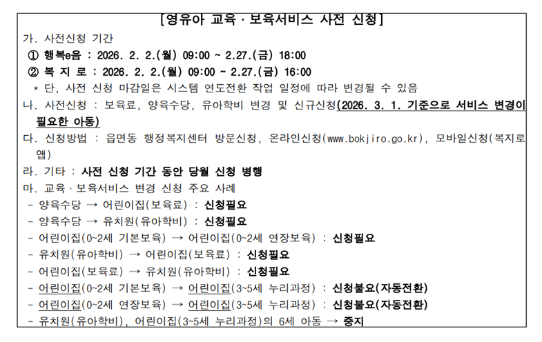 2026년 3월 새학기를 맞이하여 영유아 교육·보육서비스(보육료, 양육수당 등)의 온라인신청이 증가할 것으로 예상되어, 국민의 편의 제고 및 지자체 업무 부담 완화를 위해 아래와 같이 사전 신청을 개시합니다.