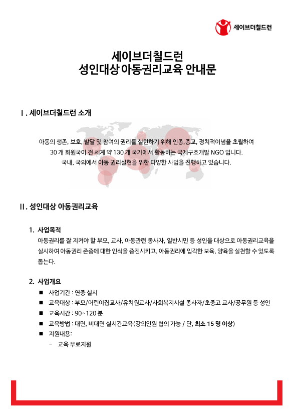 세이브더칠드런코리아 남부지역본부는 아동권리에 대한 성인 인식 제고를 위해 성인을 대상으로 한 아동권리교육을 운영하고 있습니다.
