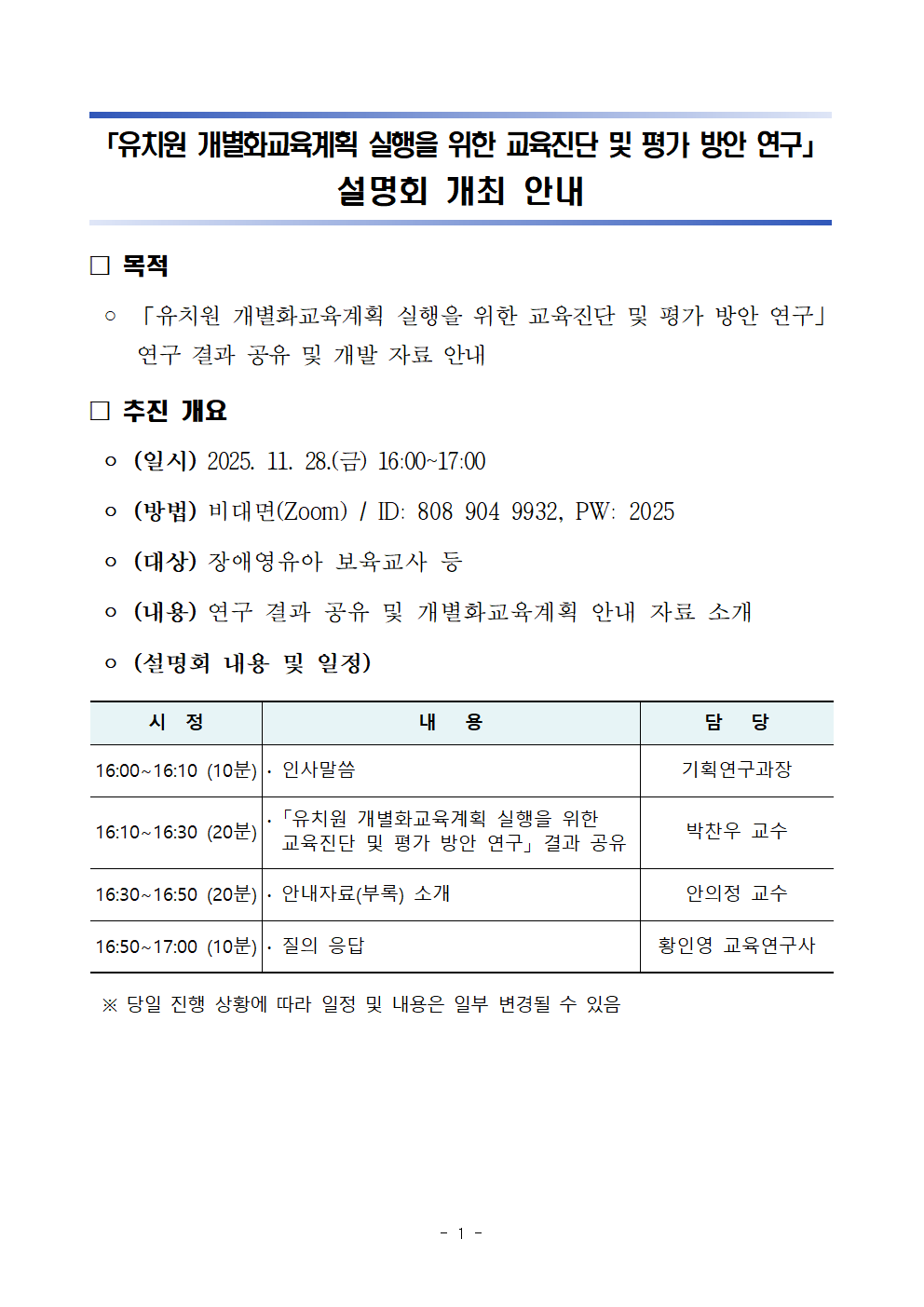 [문서자료] 「유치원 개별화교육계획 실행을 위한 교육진단 및 평가 방안 연구」 설명회 개최 안내