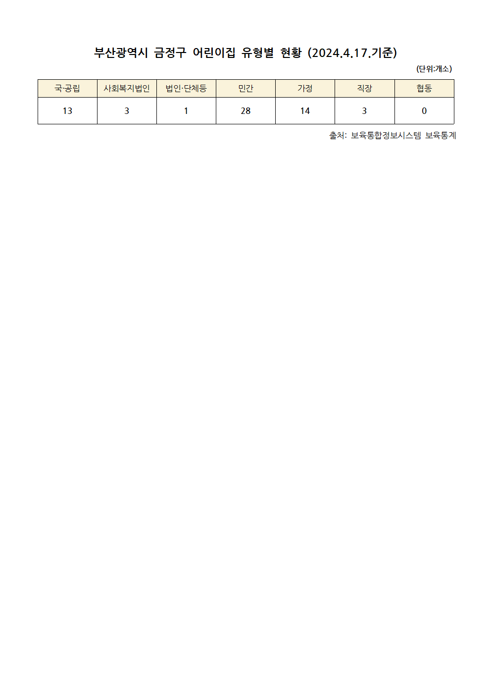 [어린이집현황] 2024년 4월 부산광역시 금정구 어린이집 유형별 현황