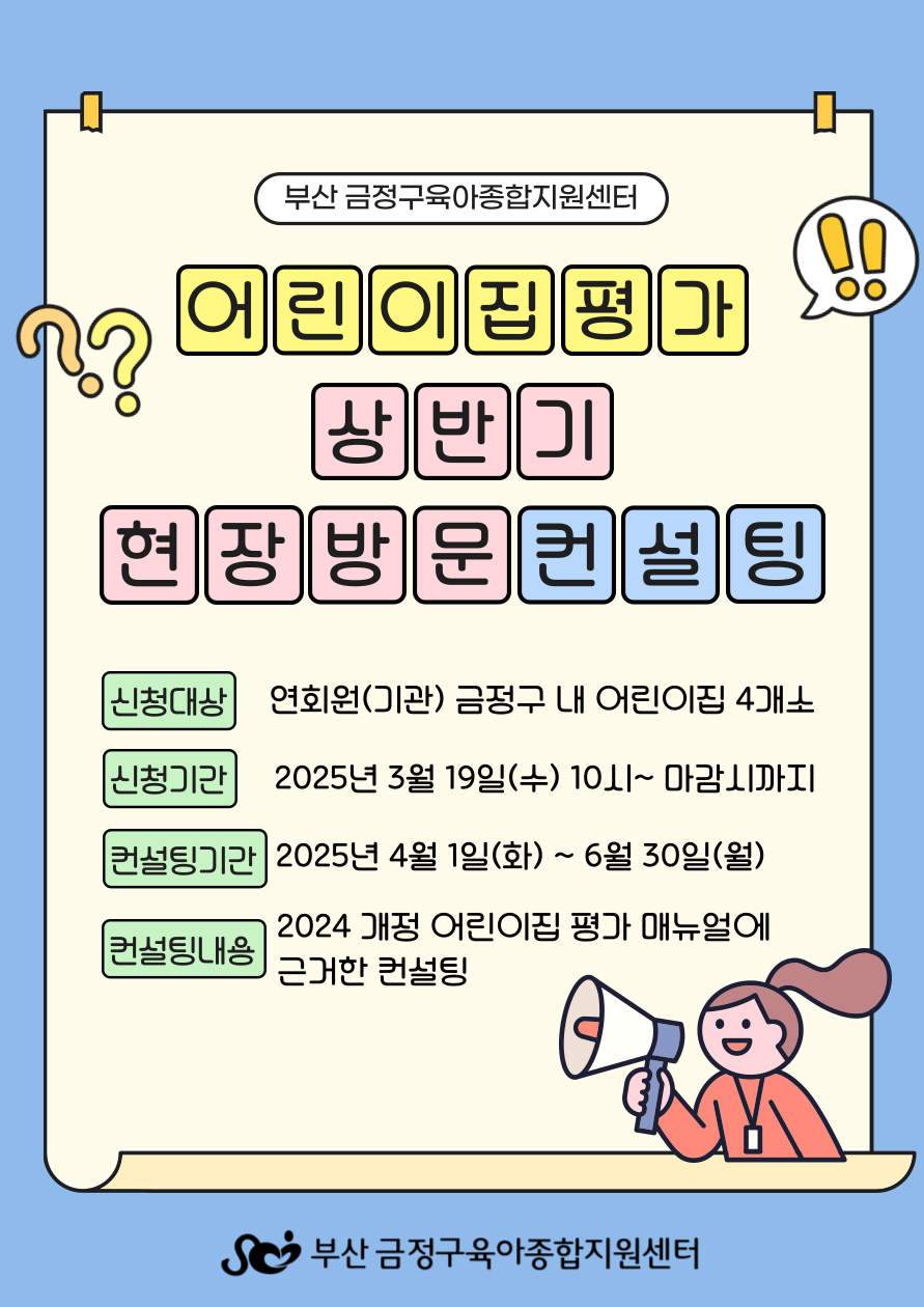 금정구육아종합지원센터 기관 연회원 대상이며 금정구 관내 어린이집 대상으로 진행되오니 많은 관심과 참여 바랍니다.