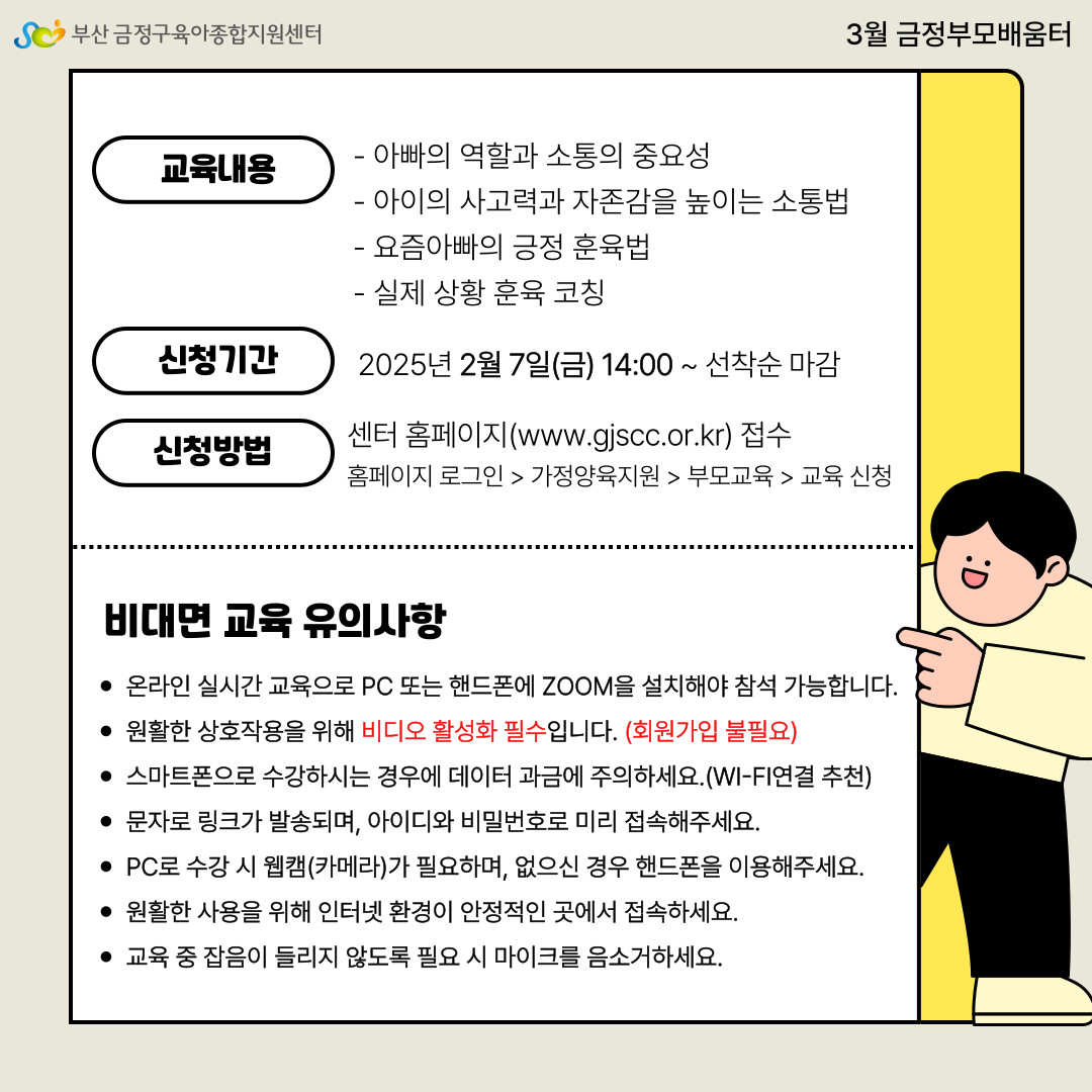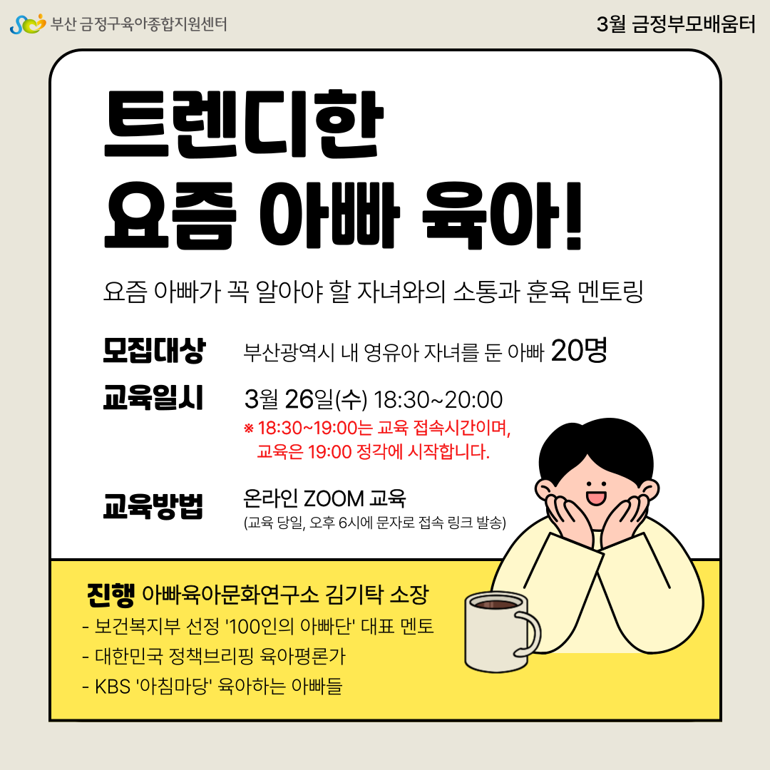 ○ 교육대상 : 부산광역시 내 영유아 자녀를 둔 아빠(선착순 20명)