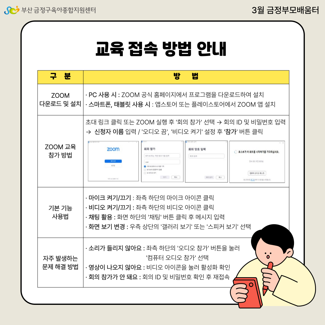 - 교육 당일 오후 6시에 문자로 zoom 링크를 보내드립니다.