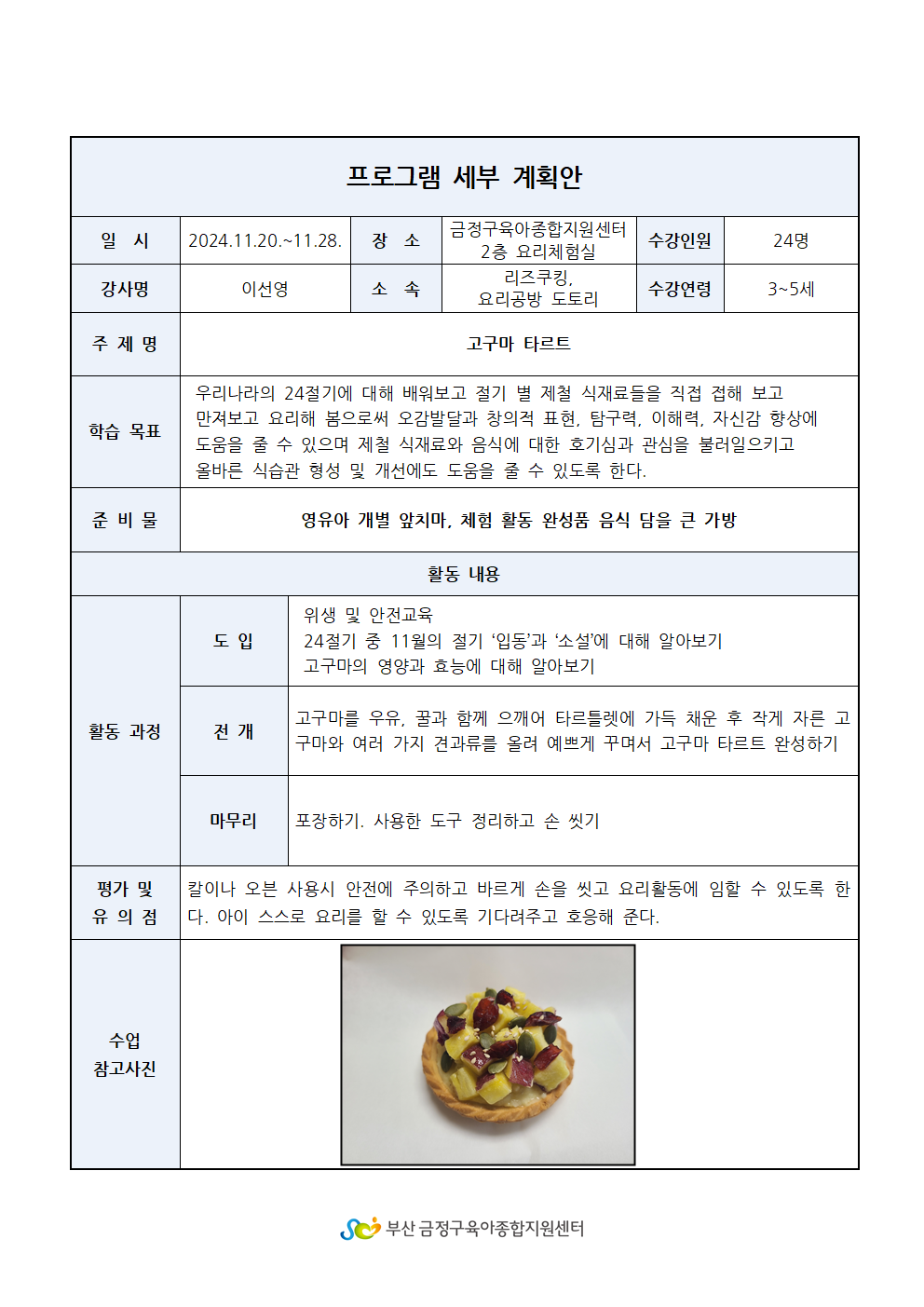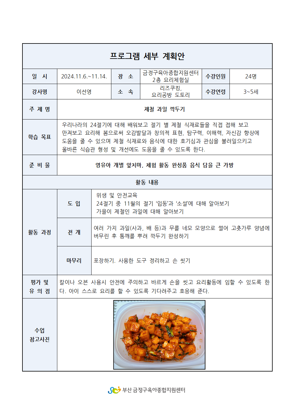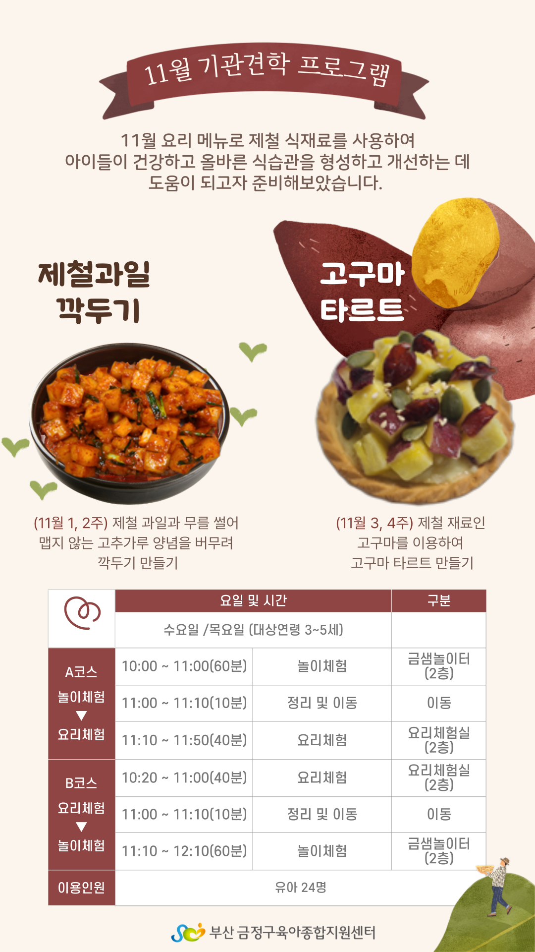 • 요리명: 11월 1, 2주 제철 과일 깍두기/ 11월 3, 4주 고구마 타르트