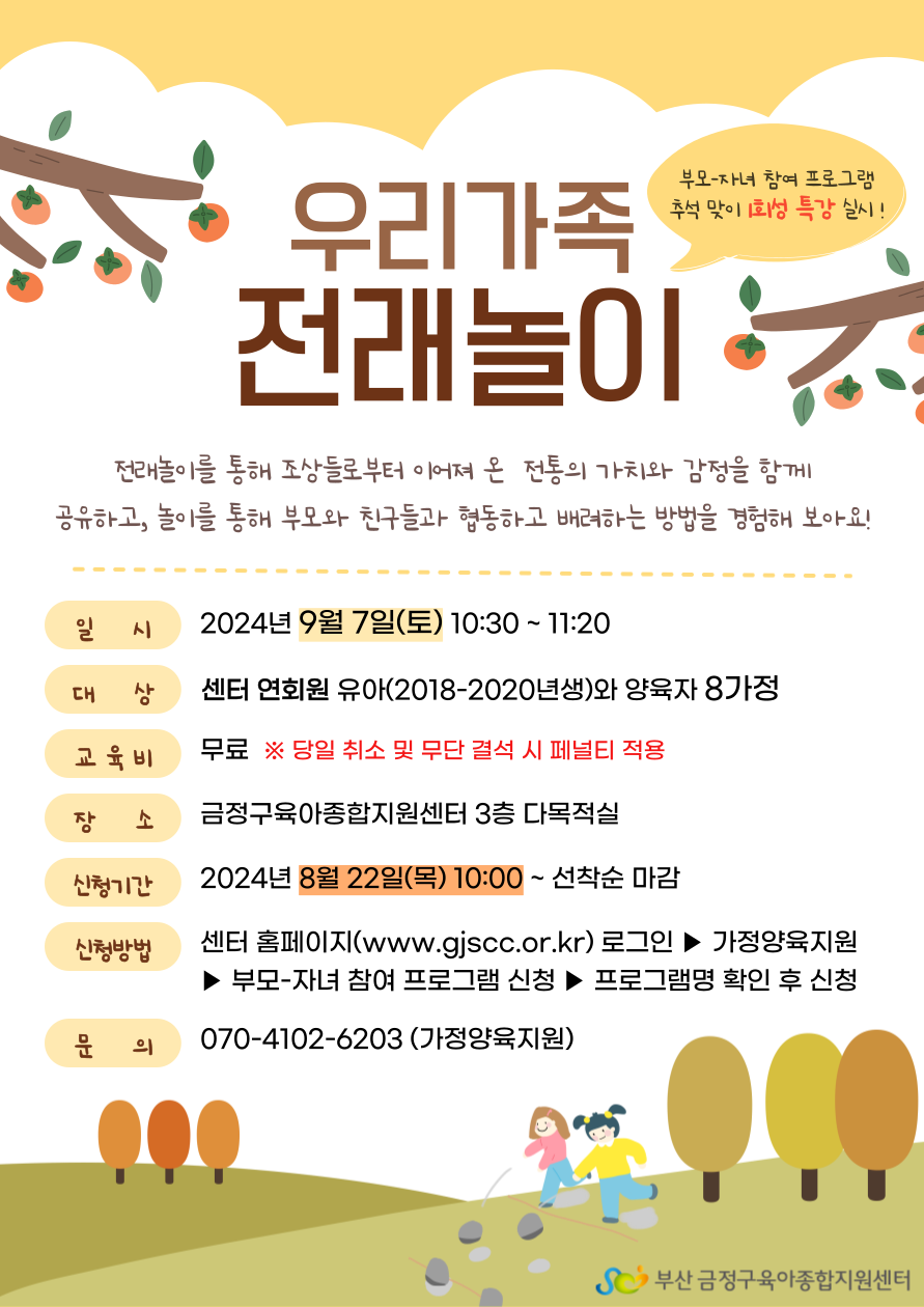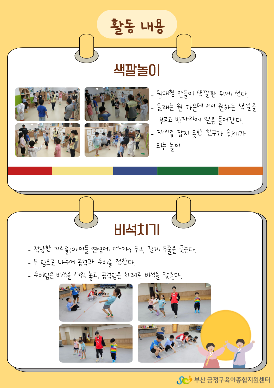 부모님, 친구들과 협동하고 배려하는 경험을 할 수 있는 전래놀이에 많은 관심과 참여 바랍니다.