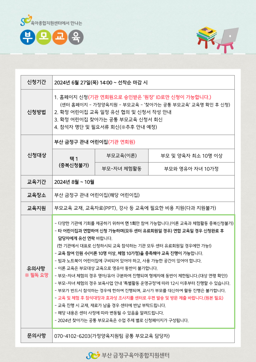 금정구육아종합지원센터에서 2024년 찾아가는 공통 부모교육을 시범 운영하고자 하오니 금정구 관내 어린이집(센터 기관 연회원)의 많은 관심과 참여 바랍니다.