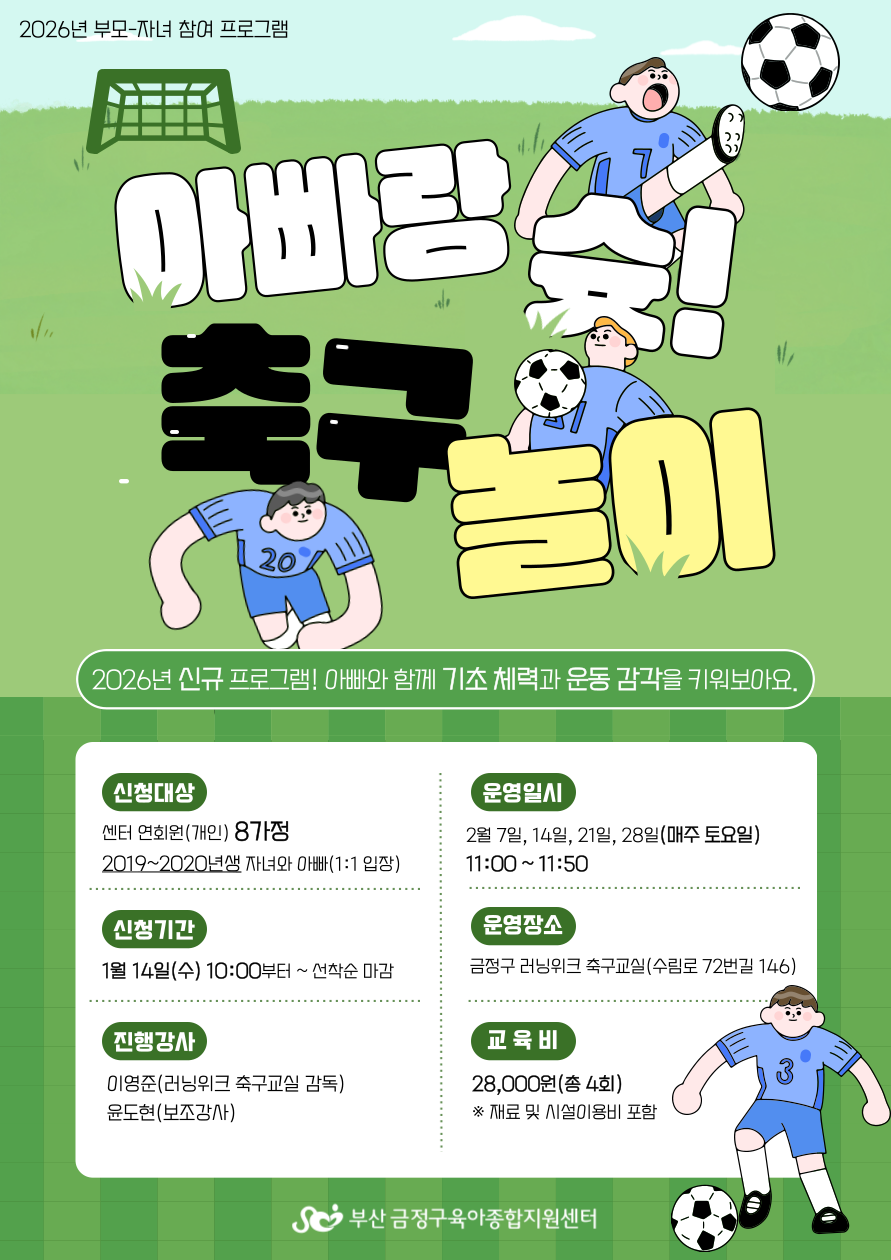 아빠와 유아(6-7세)가 함께하는 2026년 신규 부모-자녀 참여 프로그램 「아빠랑 슛! 축구놀이」에 참여해보세요.