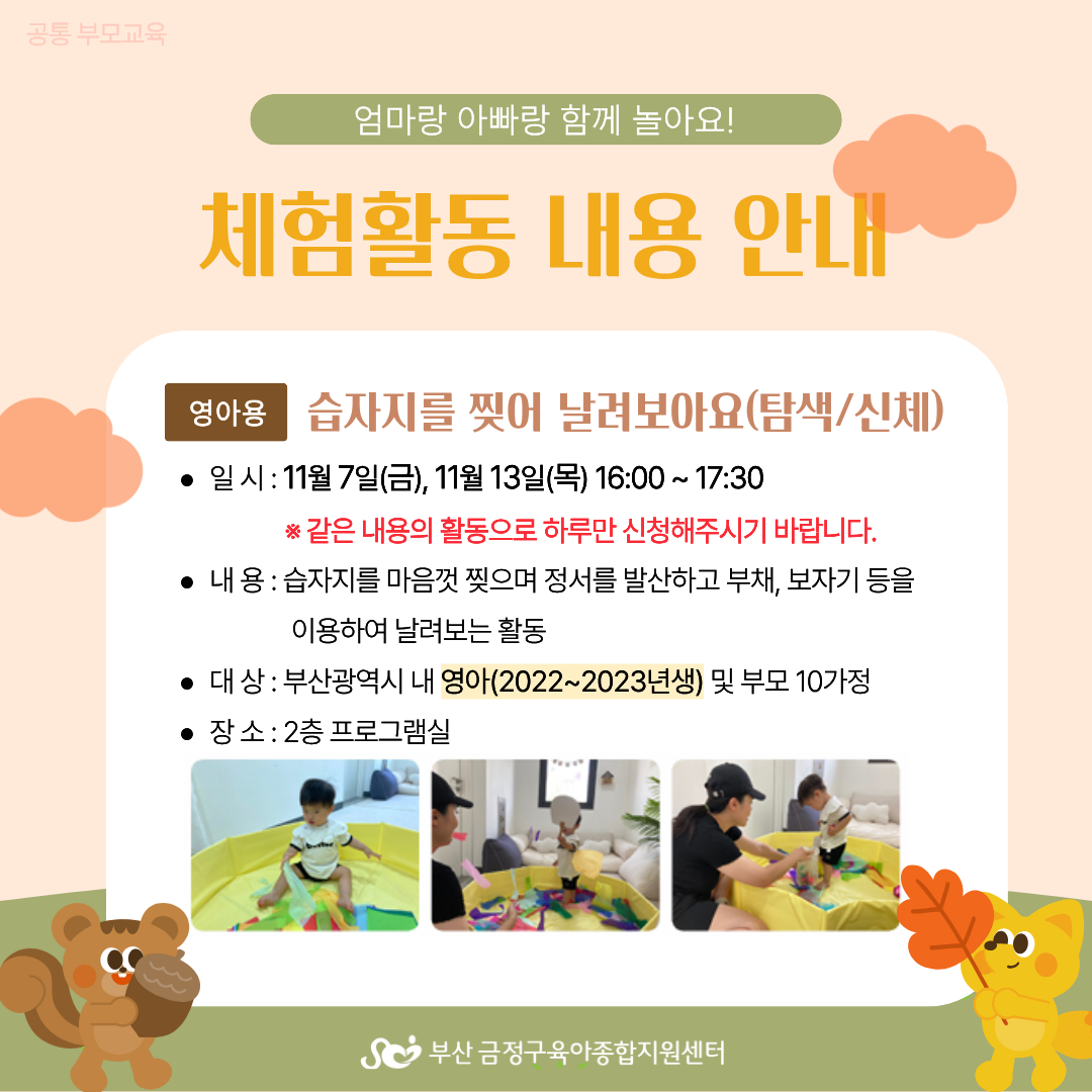 ▶ 11월 13일(목) 영아용(2022~2023년생) 체험 신청 바로가기(클릭)