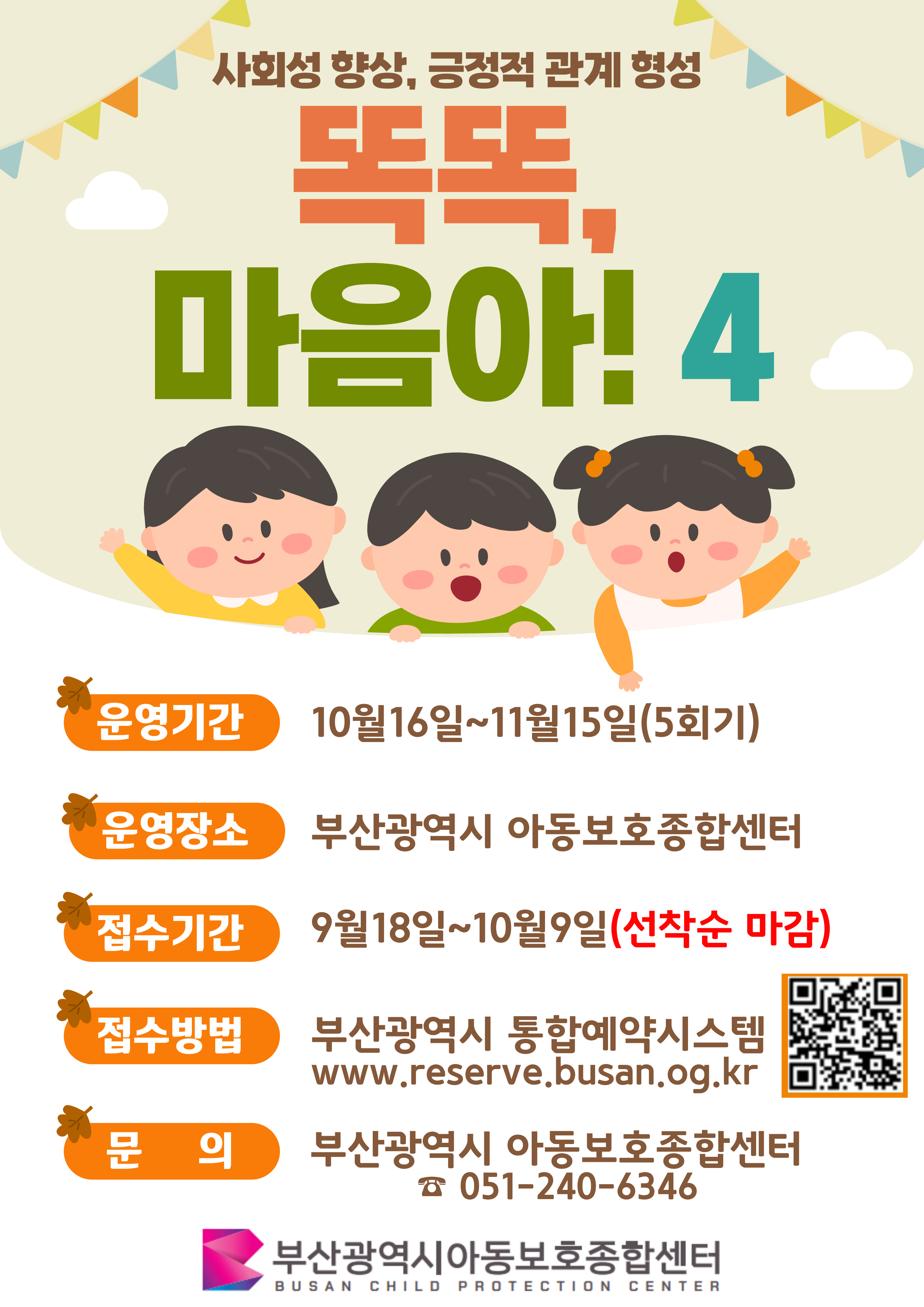 부산광역시아동보호종합센터에서는 아동과 가족의 건강한 성장을 돕기 위한 2025년 제4회 집단프로그램 "똑똑, 마음아!"를 아래와 같이 운영하오니, 참여를 휘망하시는 분들의 많은 관심과 참여를 부탁드립니다.