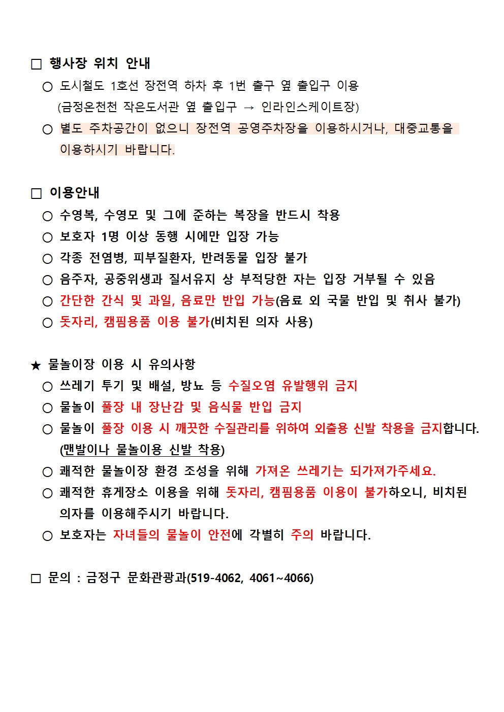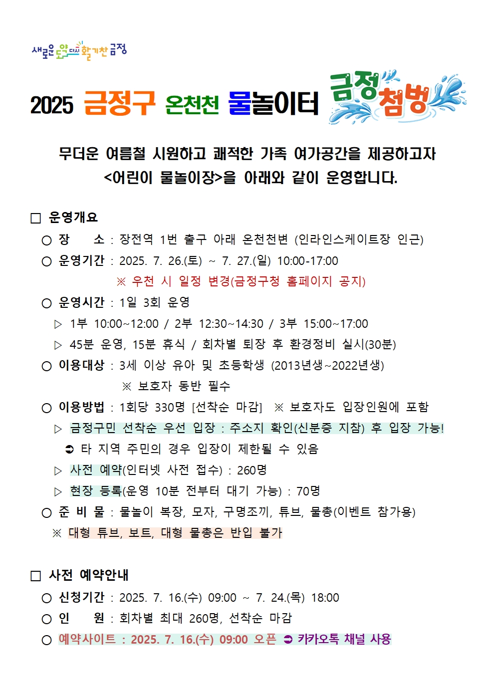 금정구 온천천 물놀이터 <금정 첨벙> 운영 안내