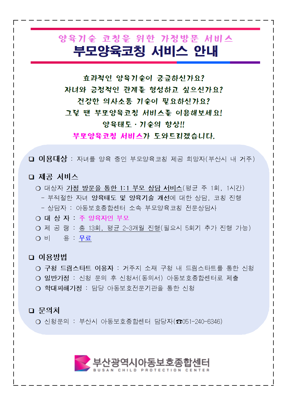 부산광역시아동보호종합센터에서는 학대피해아동가정 및 일반가정 아동의 건강한 성장을 도모하고자