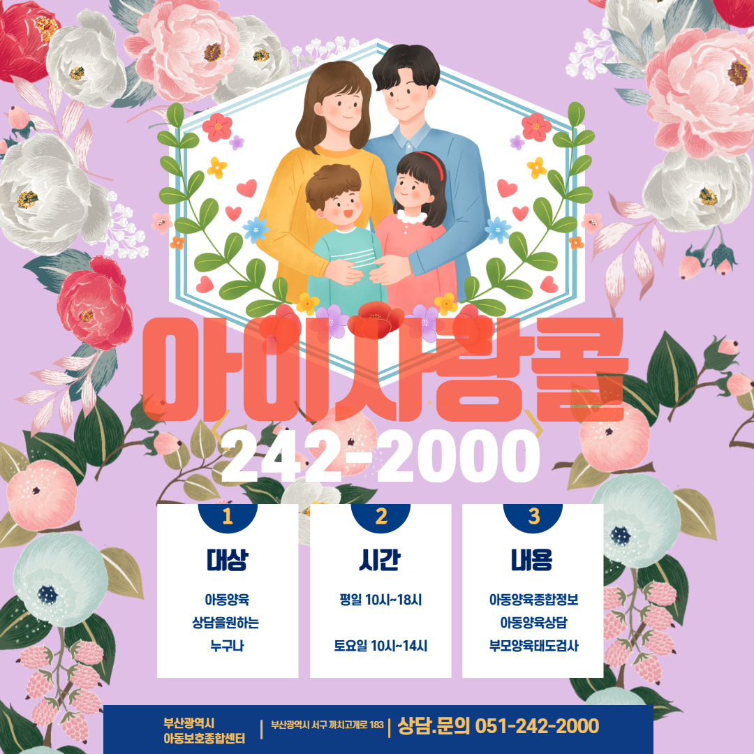 부산광역시아동보호종합센터에서는 아동양육 관련 종합 정보를 제공하고, 부모 양육 상담을 통해 아동의 건전한 성장을 도모하고자 '아이사랑콜 아동양육 상담실'을 운영하고 있습니다.