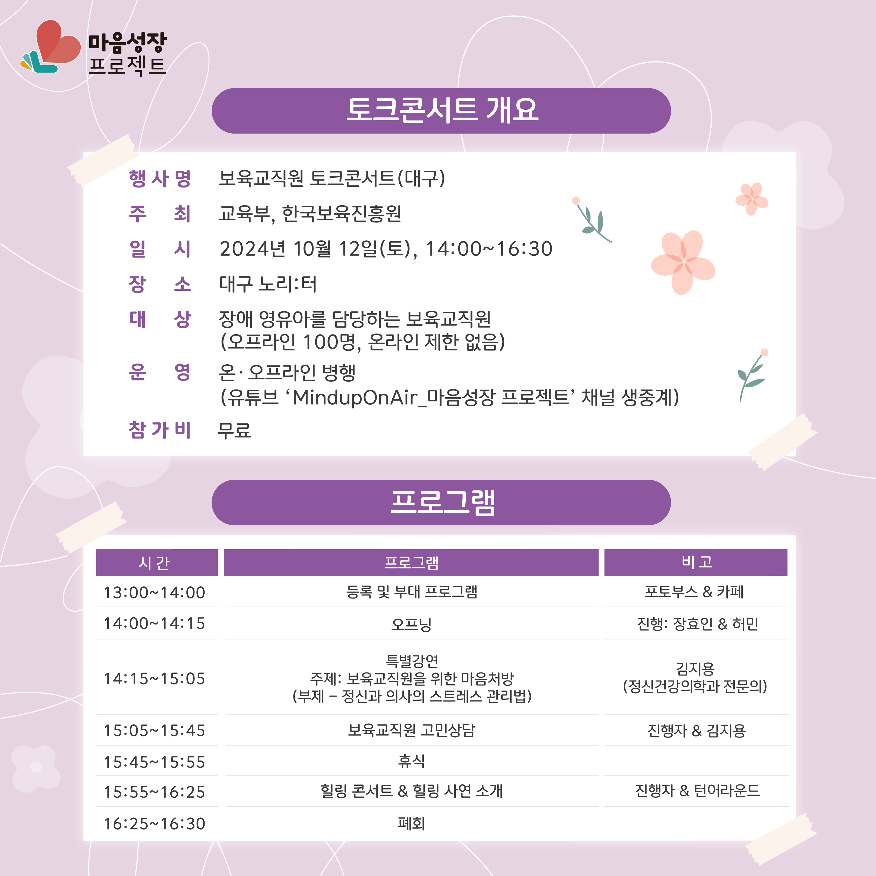 마음성장 프로젝트 토크콘서트 가치있는 우리, 동행을 개최하여 보육교직원 간 공감대 형성 및 소통의 장(대구편)을 마련하고자 합니다.