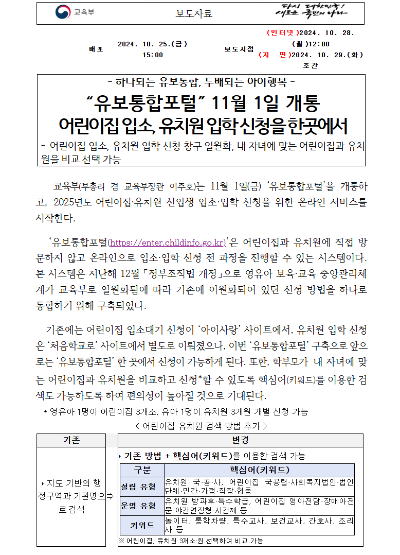 교육부(부총리 겸 교육부장관 이주호)는 11월 1일(금) ‘유보통합포털’을 개통하고, 2025년도 어린이집·유치원 신입생 입소·입학 신청을 위한 온라인 서비스를 시작합니다!