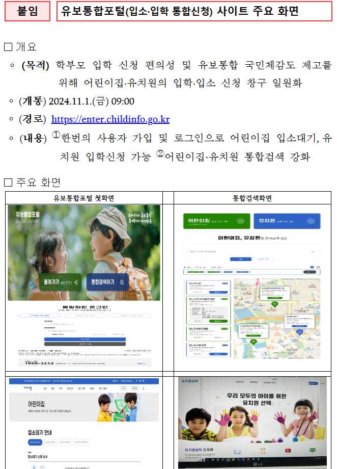 “유보통합포털” 11월 1일 개통 어린이집 입소, 유치원 입학 신청을 한곳에서