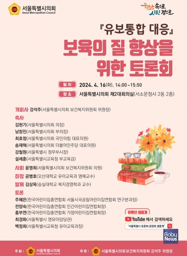 강석주 서울특별시의회 보건복지위원장이 16일 오후 2시 의회 제2대회의실에서 '유보통합 대응 보육의 질 향상을 위한 토론회'를 개최했다. 이날 토론회에서는 내년도 유보통합 전면 시행 시기를 앞두고 아직도 구체적인 시안이나 시행계획이 나오지 않은 것에 대한 현장의 불안감이 토로되는 동시에, 학부모들과 기관의 혼란에 대응하기 위해 올해 6월 전까지 어린이집과 유치원의 기관 명을 '유아학교(영유아학교)'로 통일해야 한다는 주장도 나왔다.