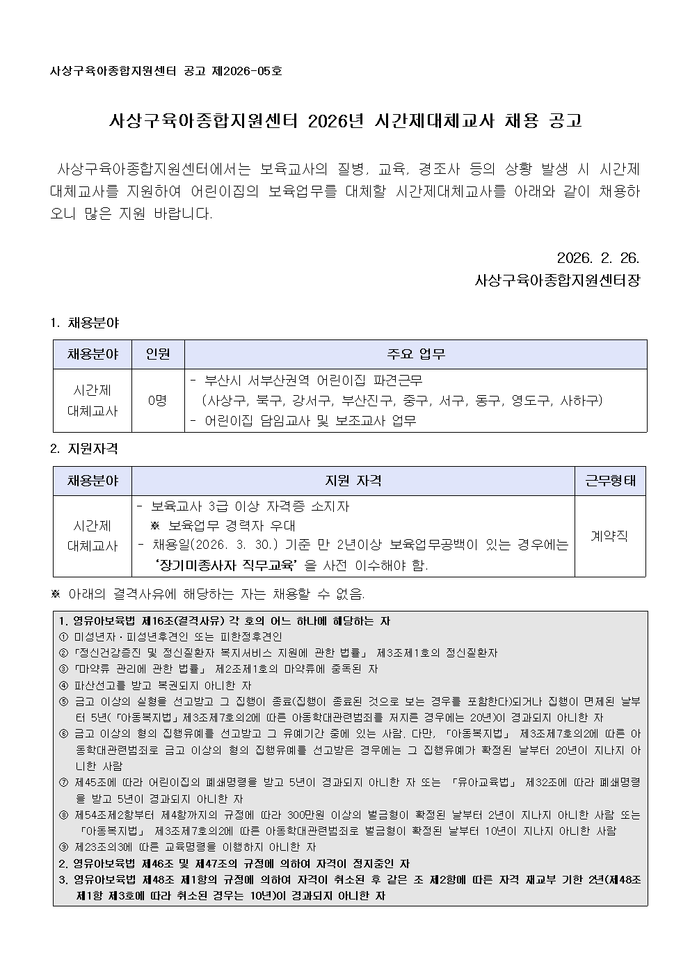 (붙임1)사상구육아종합지원센터 2026년 시간제대체교사 채용 공고문(26-05).hwp