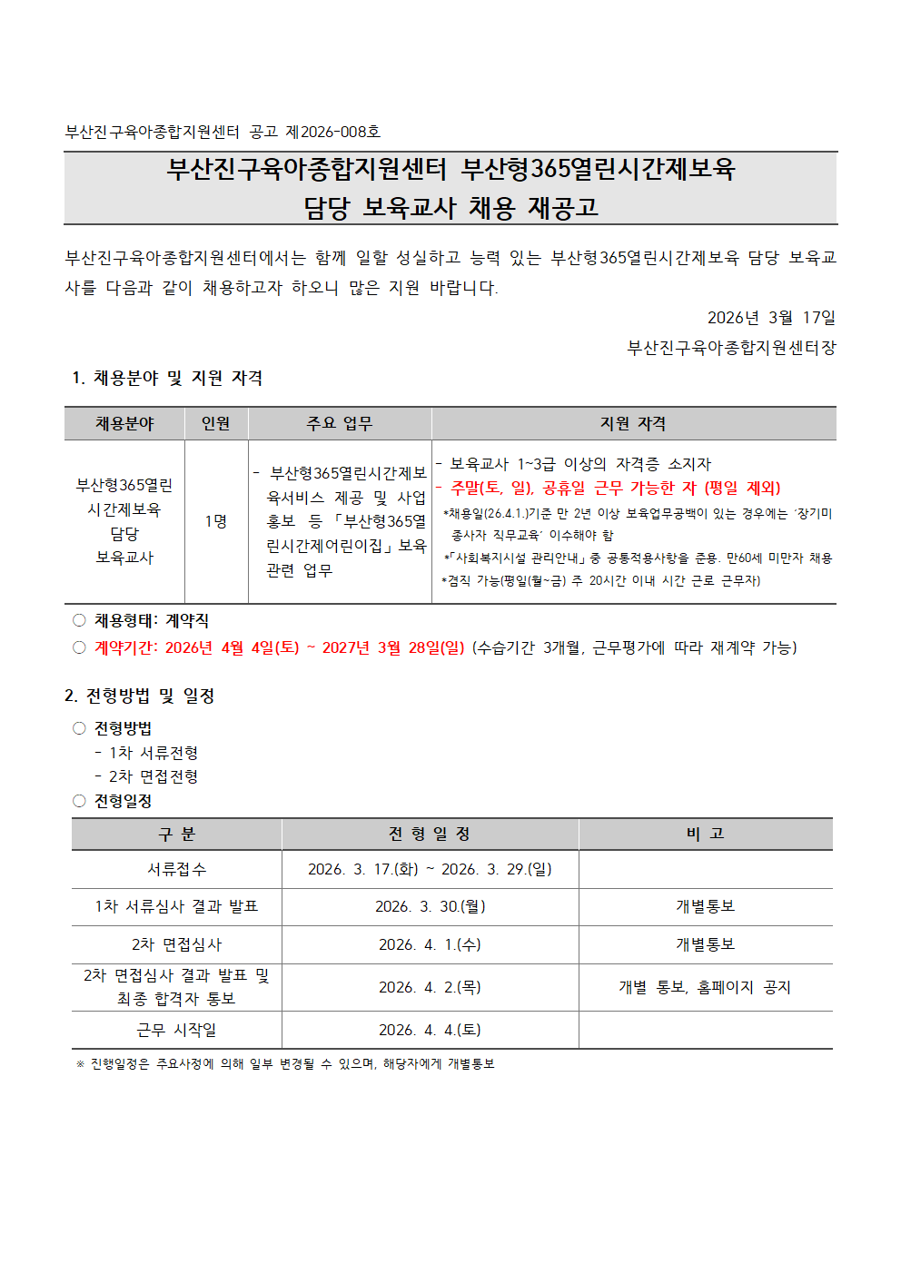 붙임 1. 부산진구육아종합지원센터 부산형365열린시간제보육 담당 보육교사 채용 재공고 (1).hwp