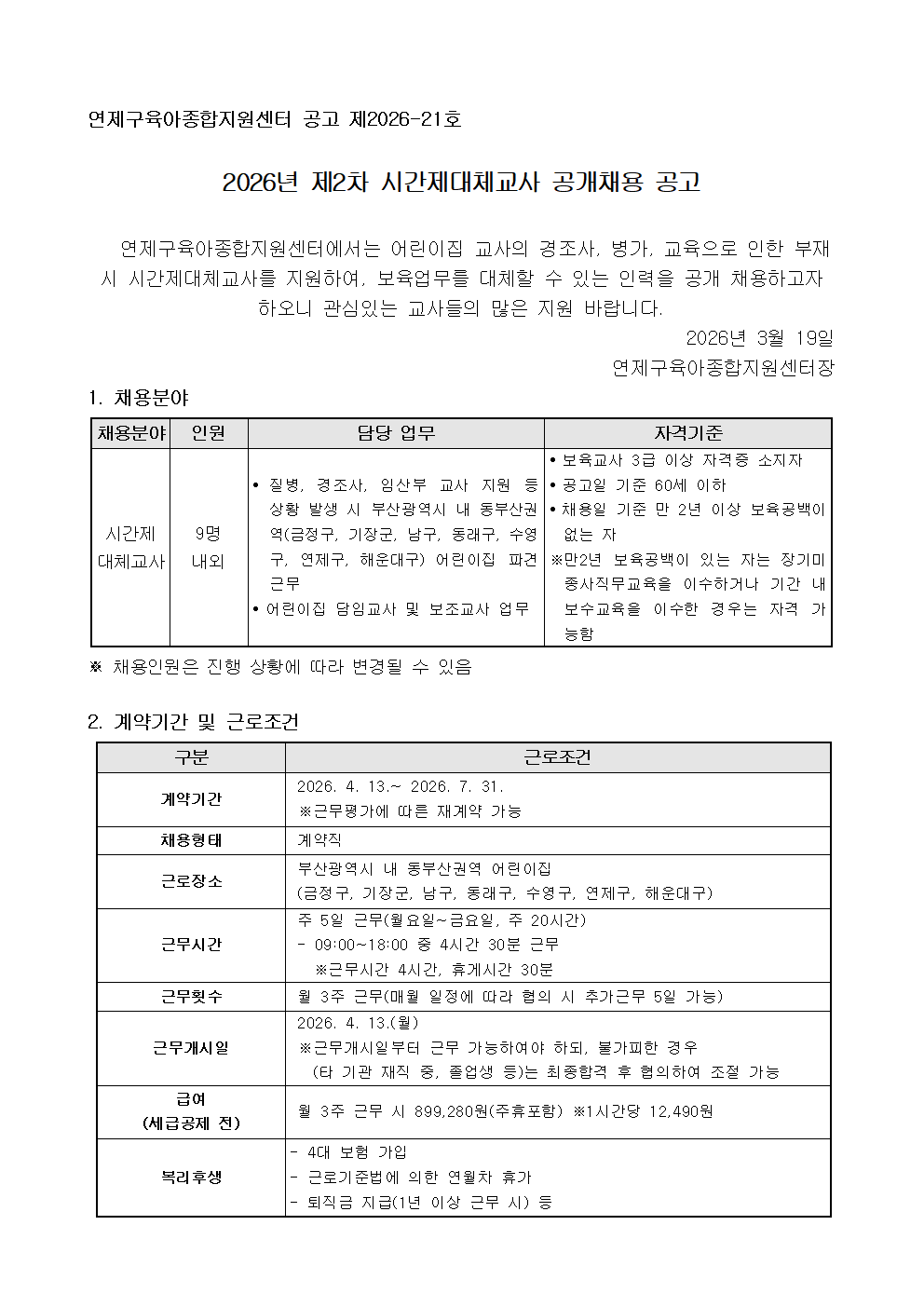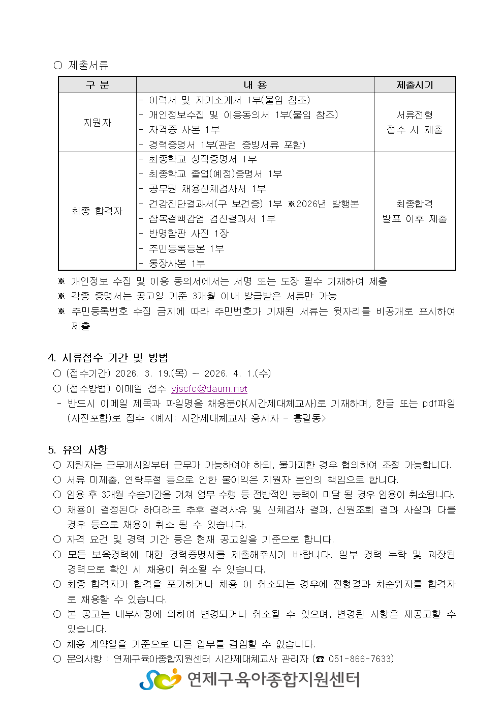 붙임1_연제구육아종합지원센터 제2차 시간제대체교사 공개채용 공고문 1부.hwp