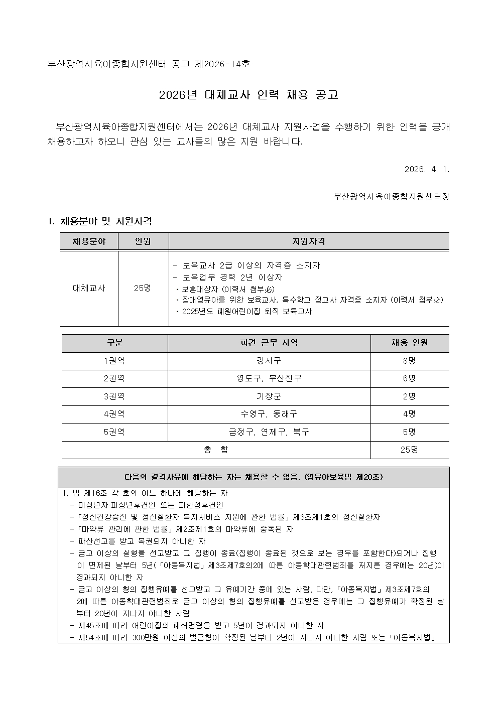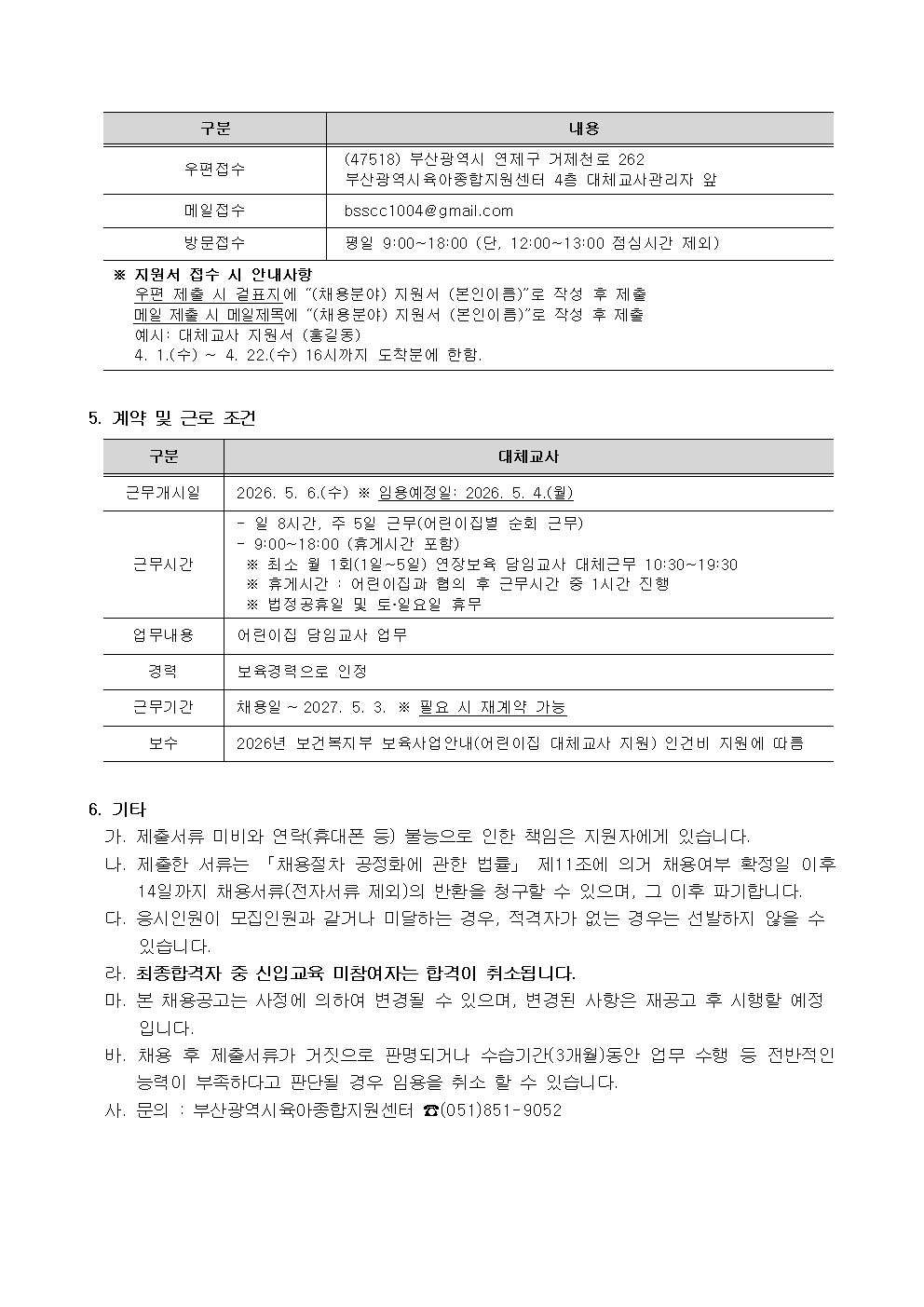 [부산광역시육아종합지원센터] 2026년 대체교사 인력 채용 공고