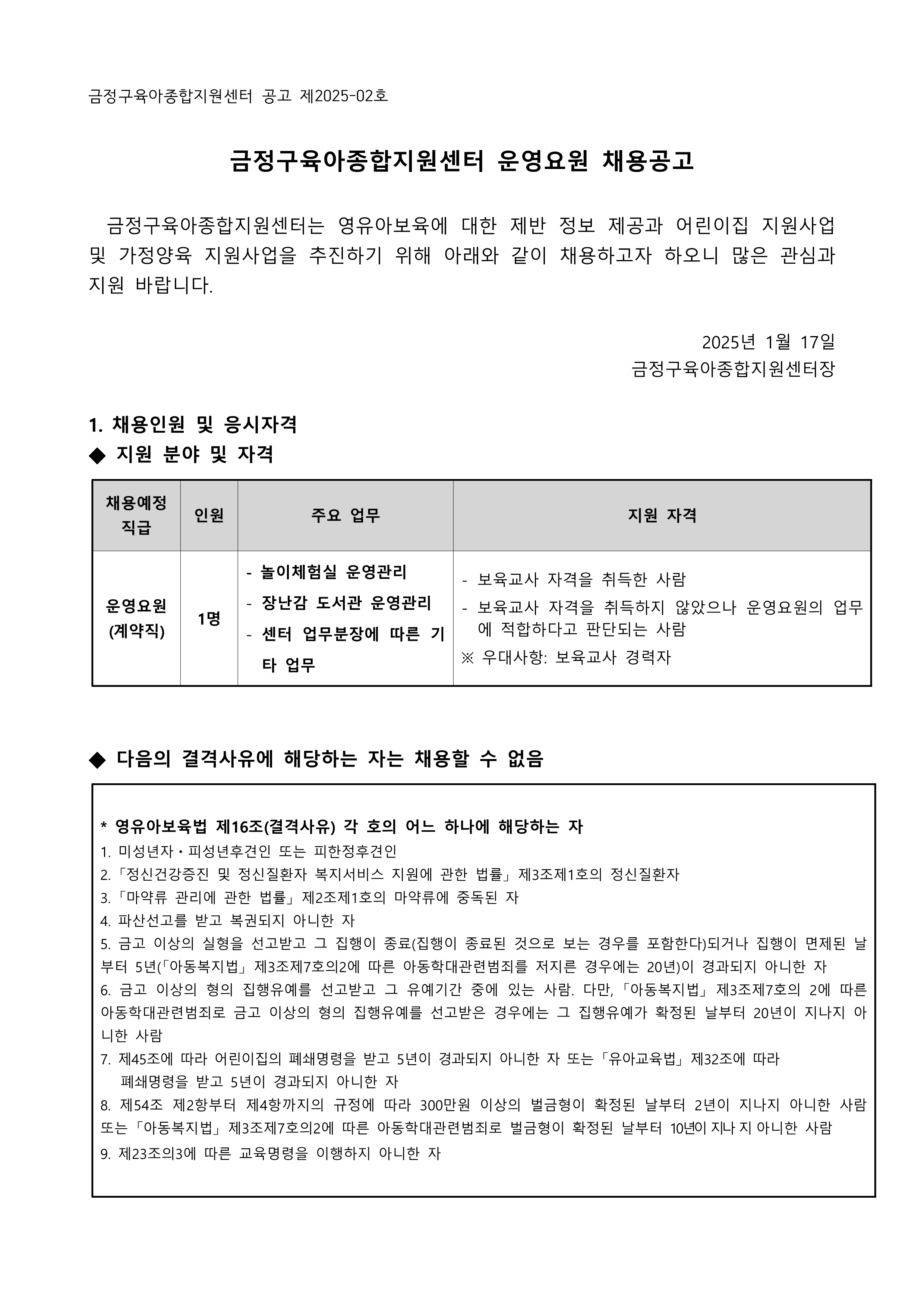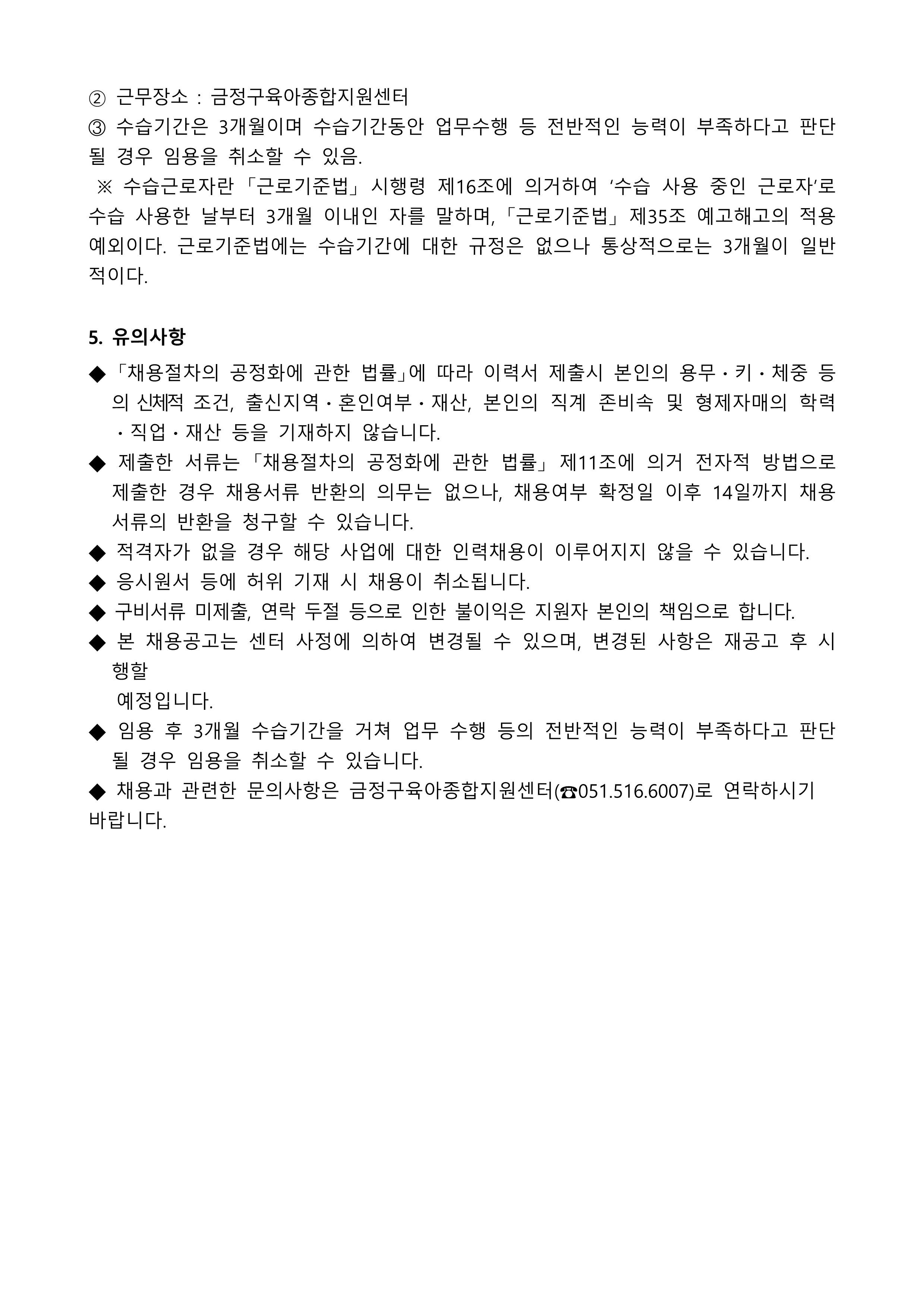 금정구육아종합지원센터 직원(운영요원) 채용공고