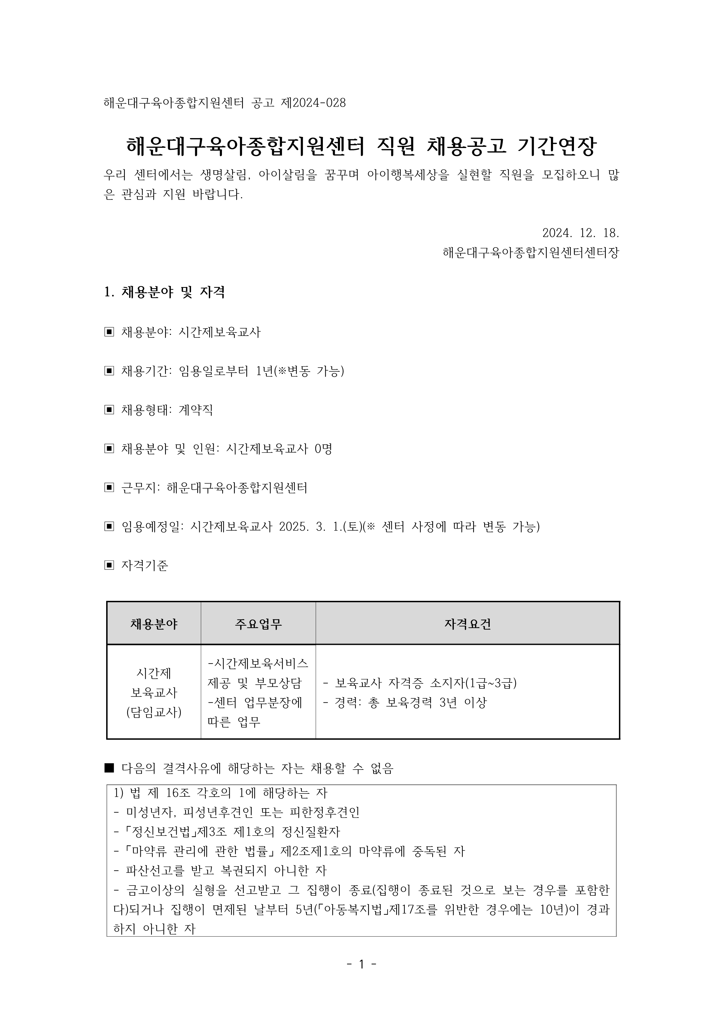 [해운대육아종합지원센터] 직원 채용 기간 연장 공고