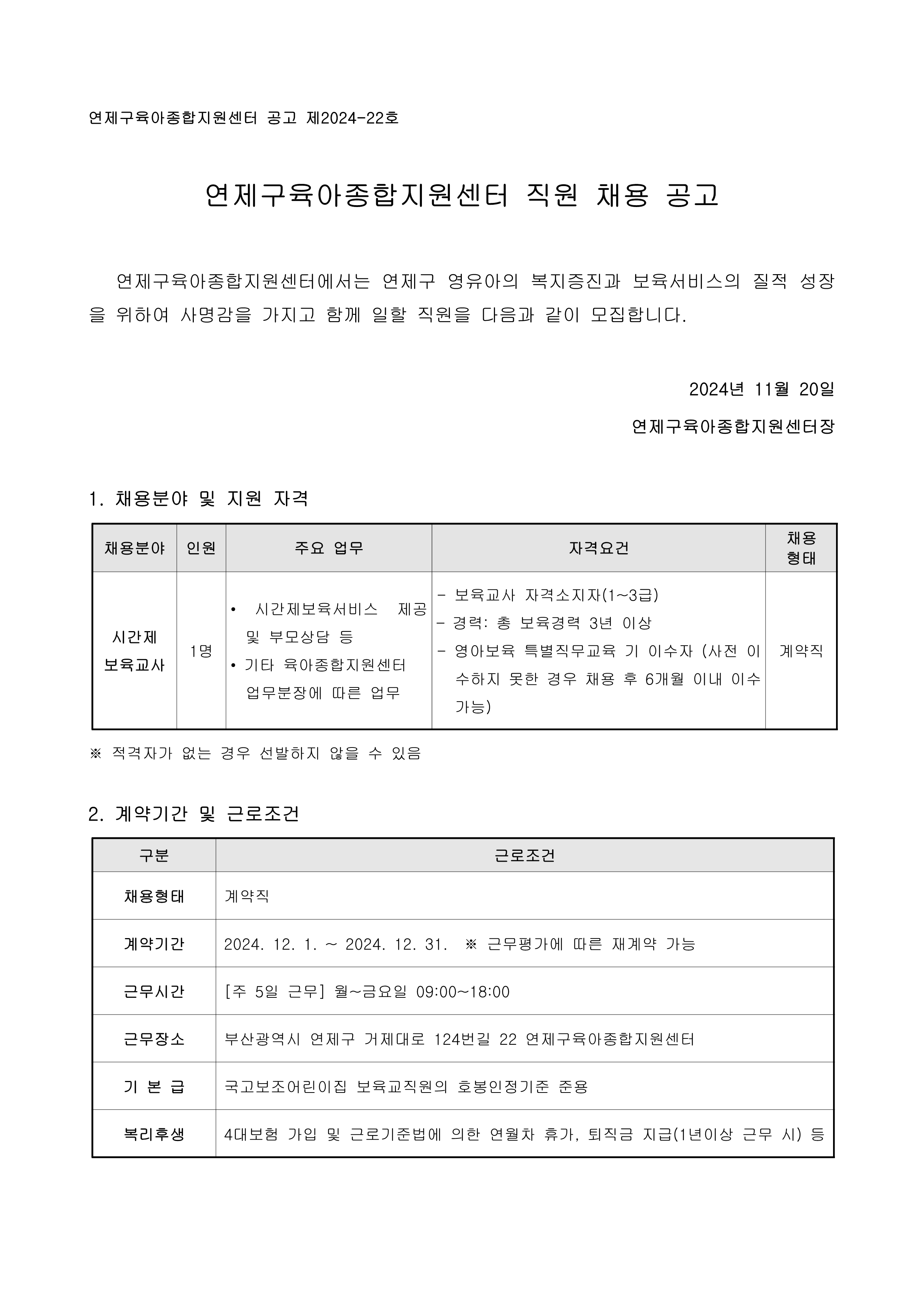[부산진구육아종합지원센터] 시간제보육 보조교사 채용 재공고