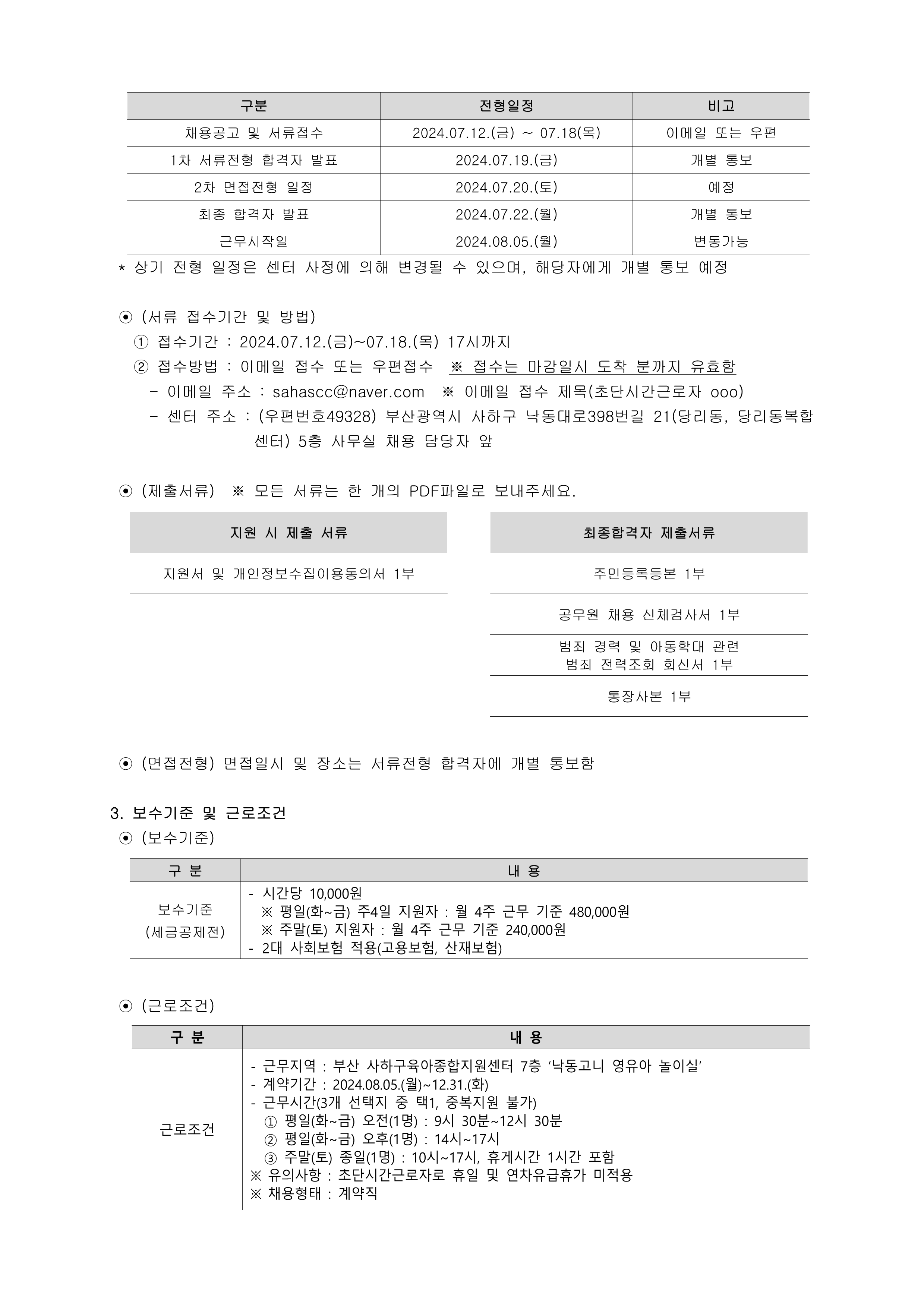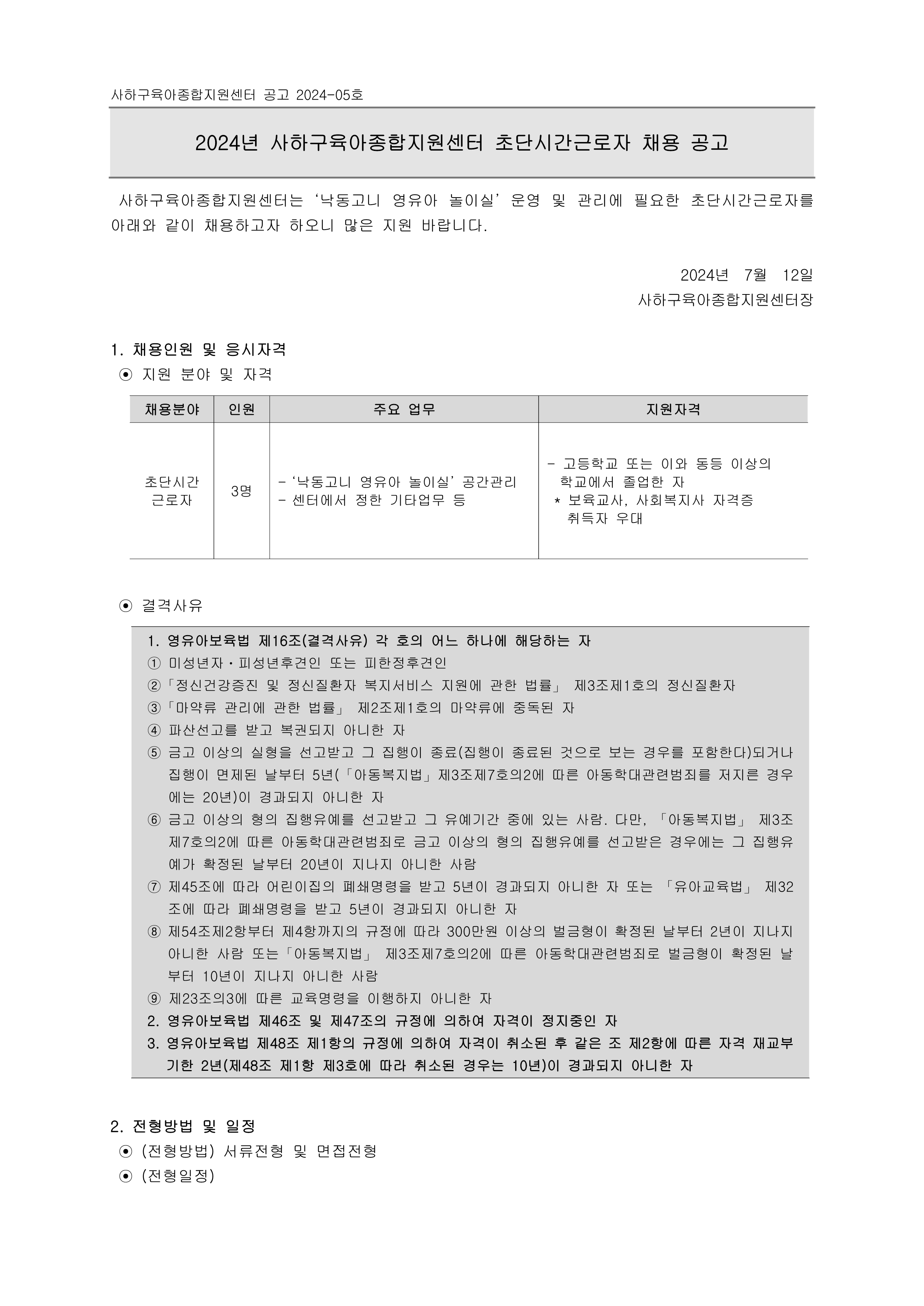 [사하구육종합지원센터] 직원(초단시간근로자) 채용 공고