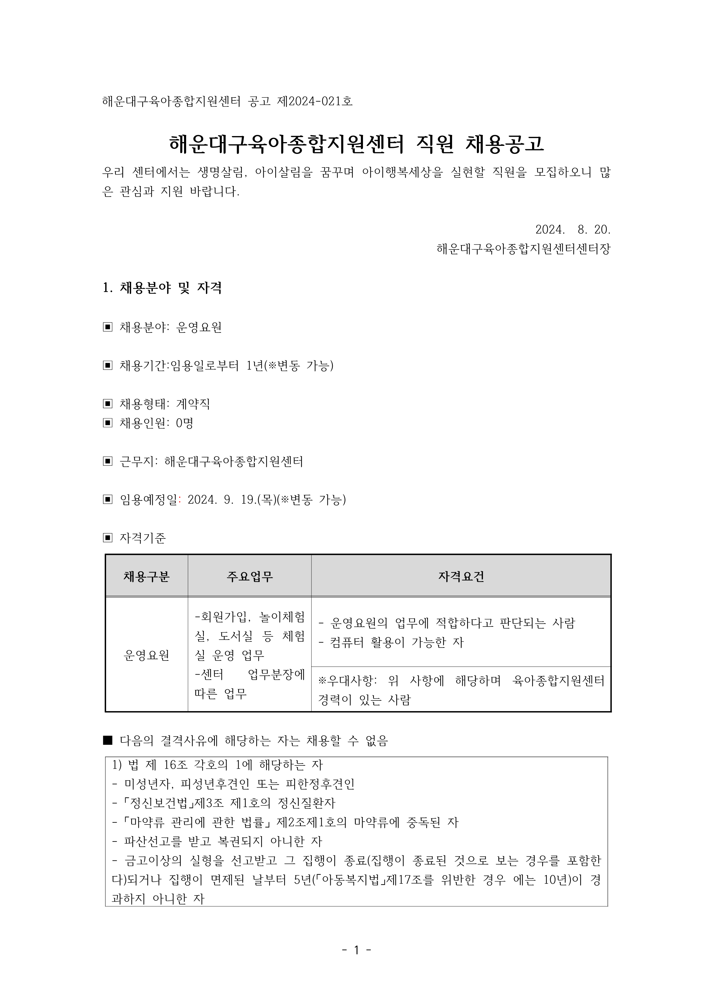[해운대구육종합지원센터] 직원 채용 공고