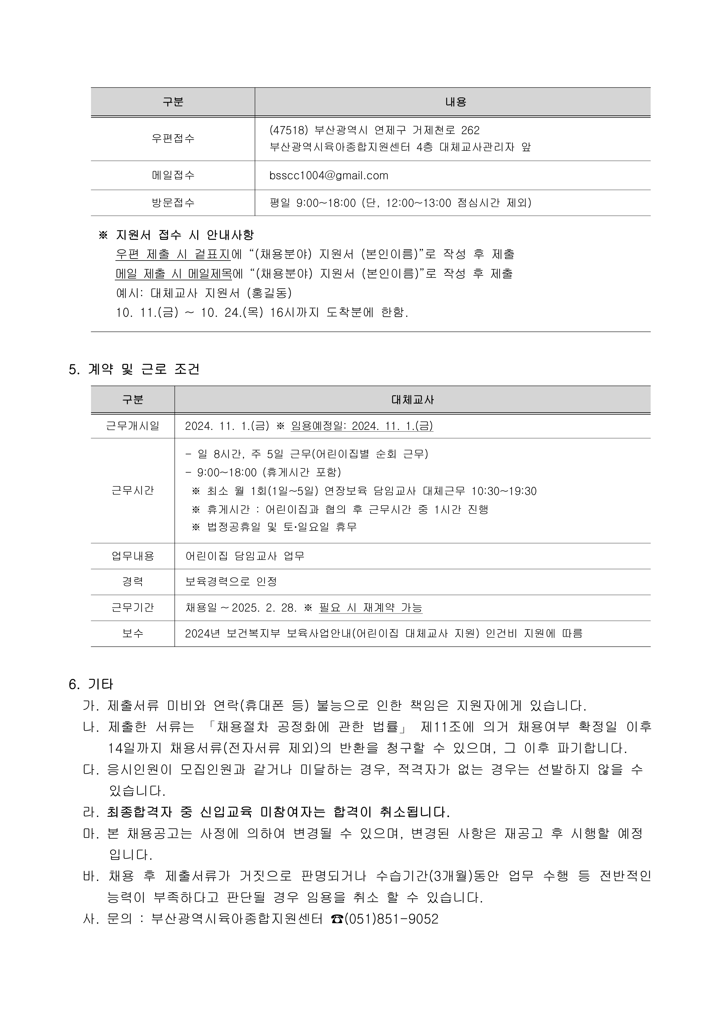 [연제구육종합지원센터] 2024년 제4차 시간제대체교사 공개채용 공고