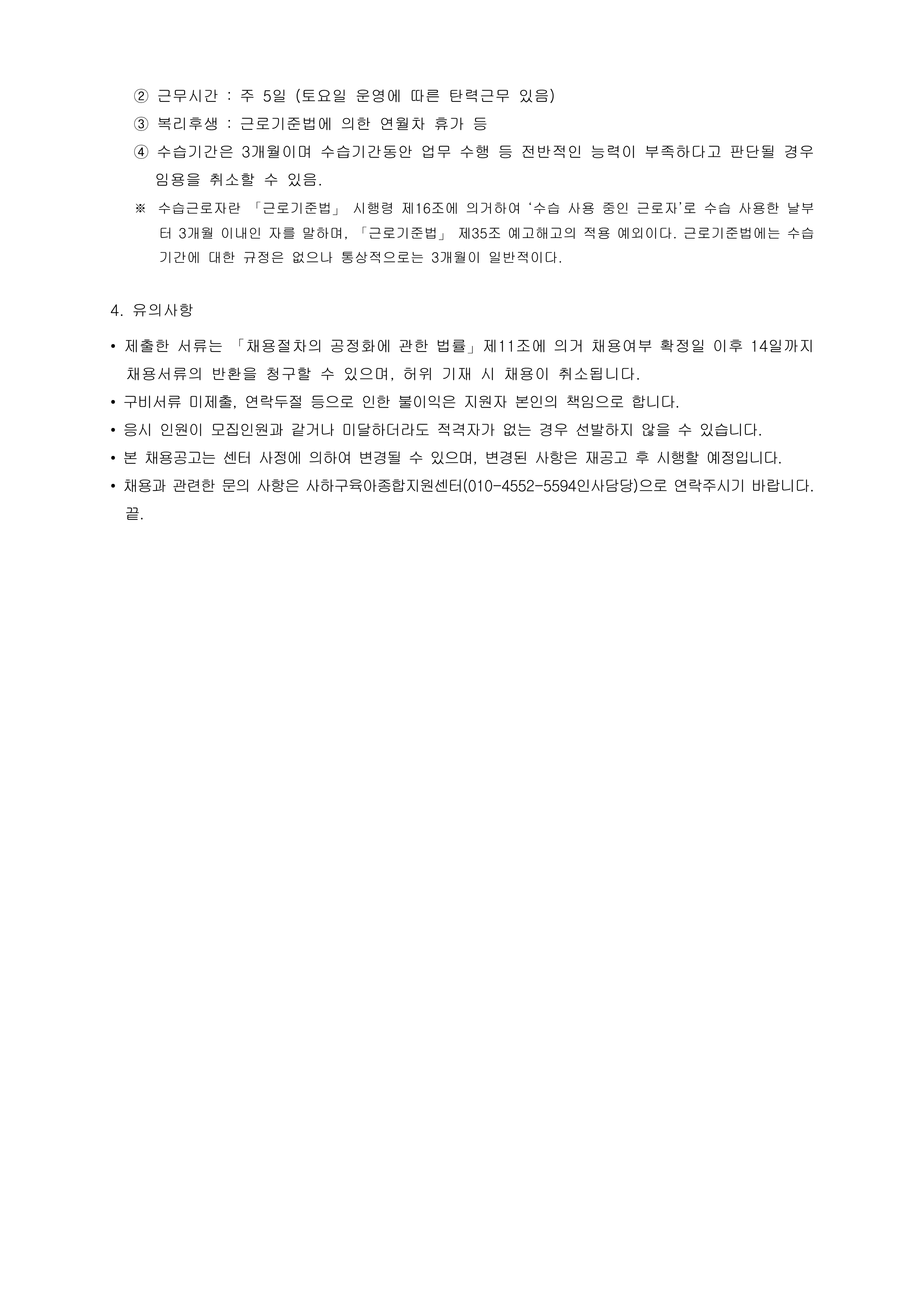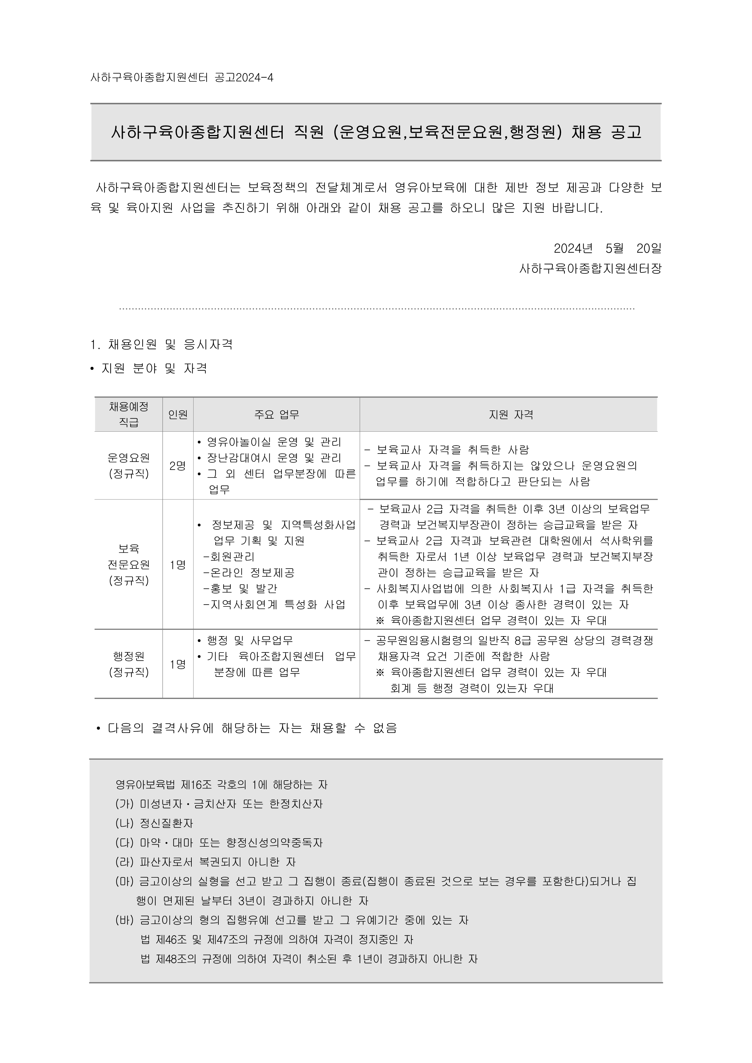 [사하구육아종합지원센터] 직원(운영요원,보육전문요원,행정원) 채용 공고