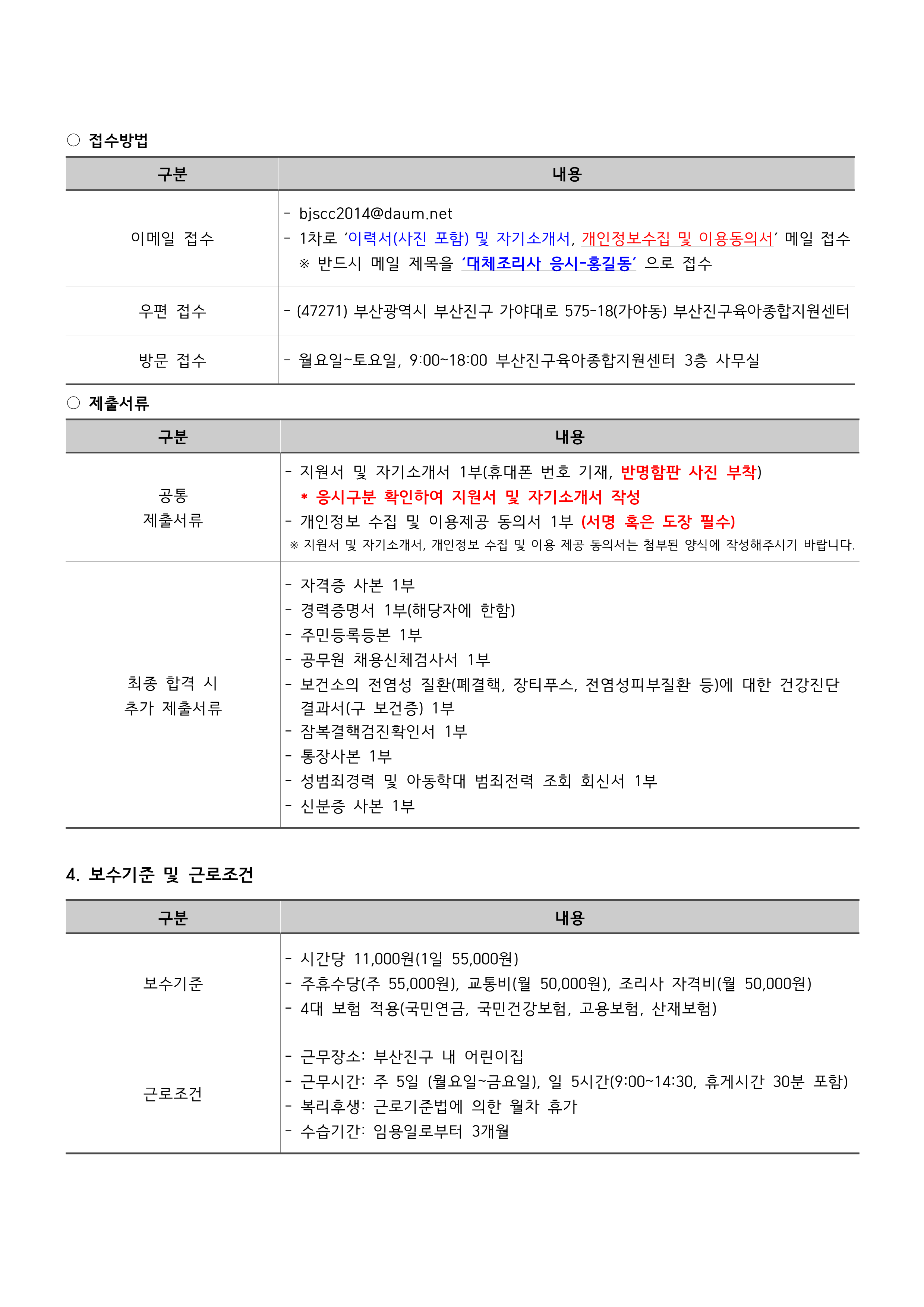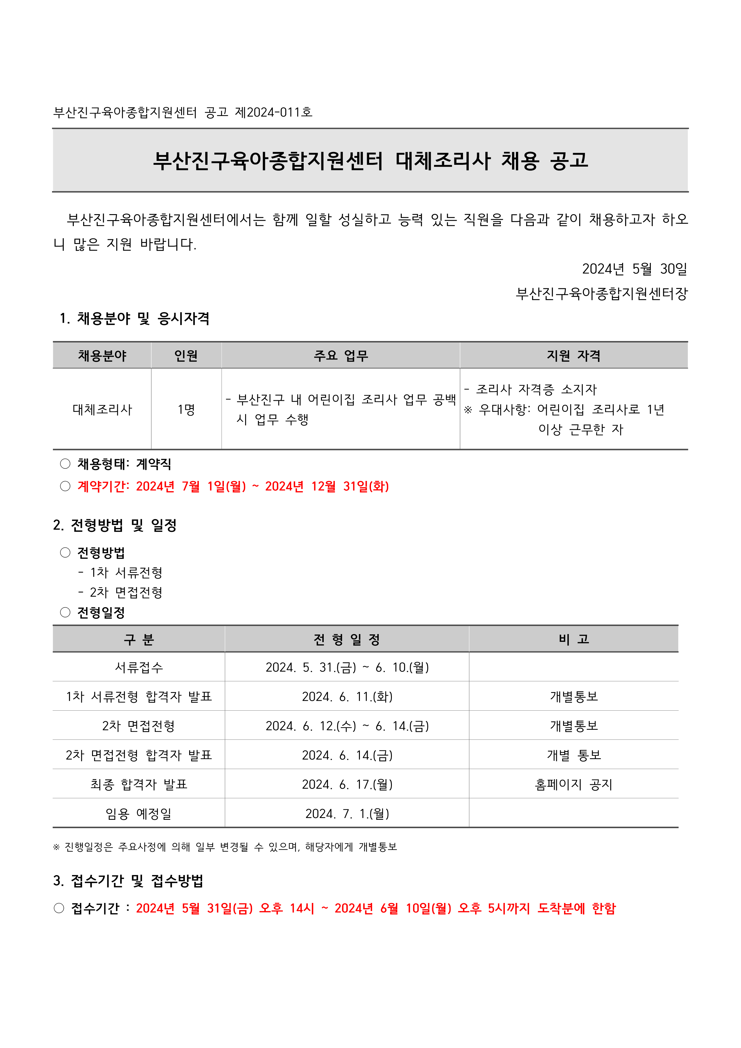 [부산진구육아종합지원센터] 대체조리사 채용 공고