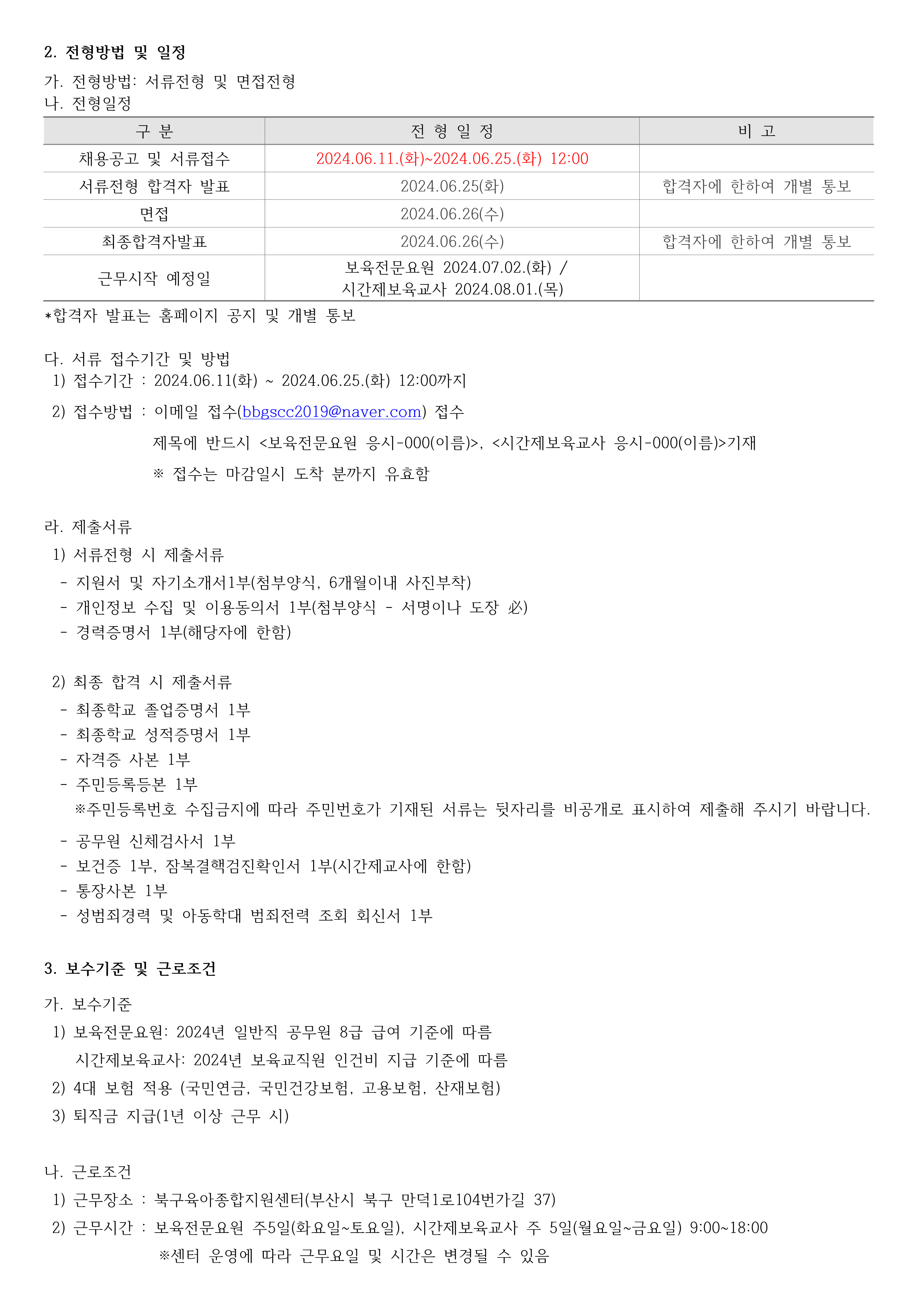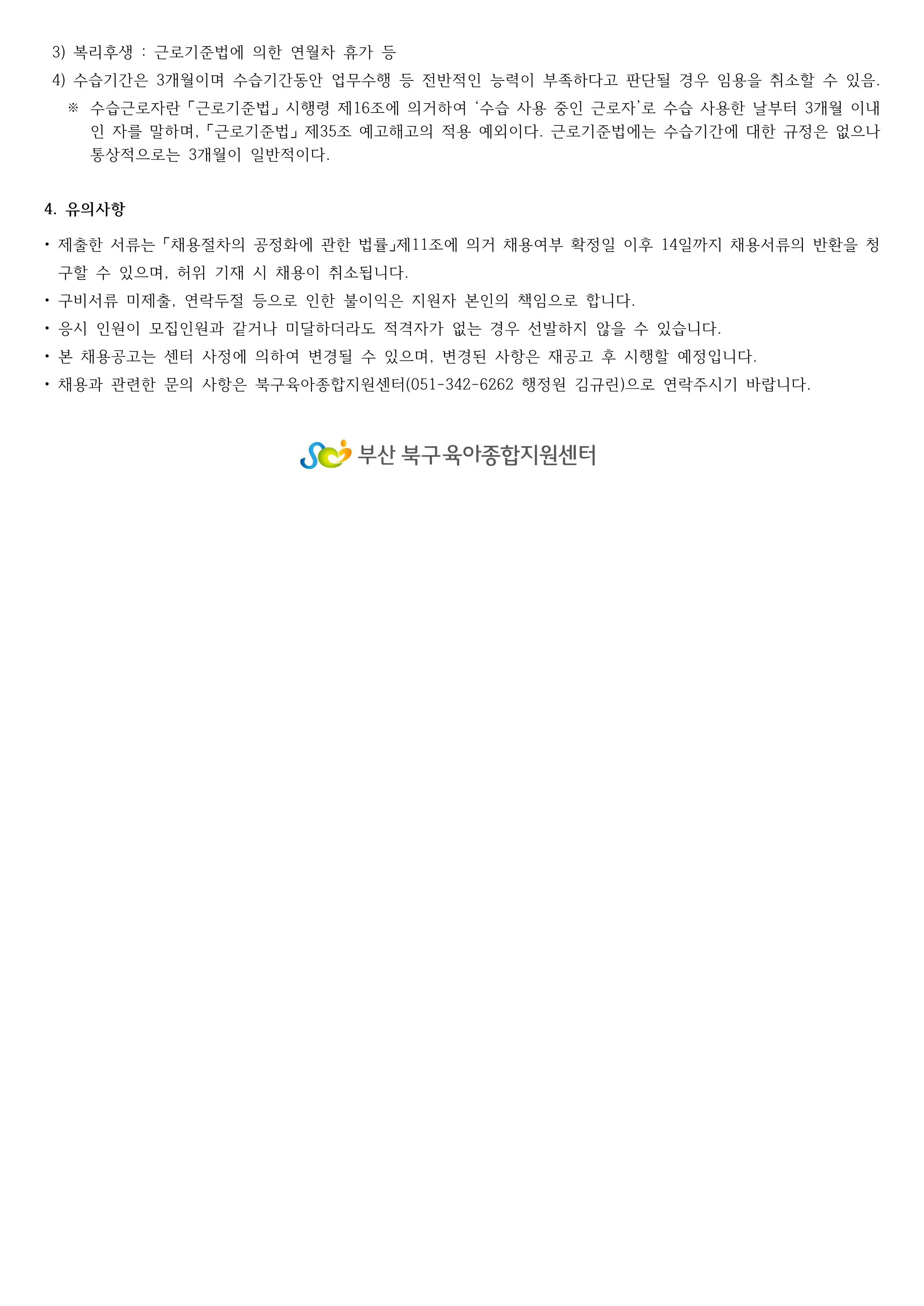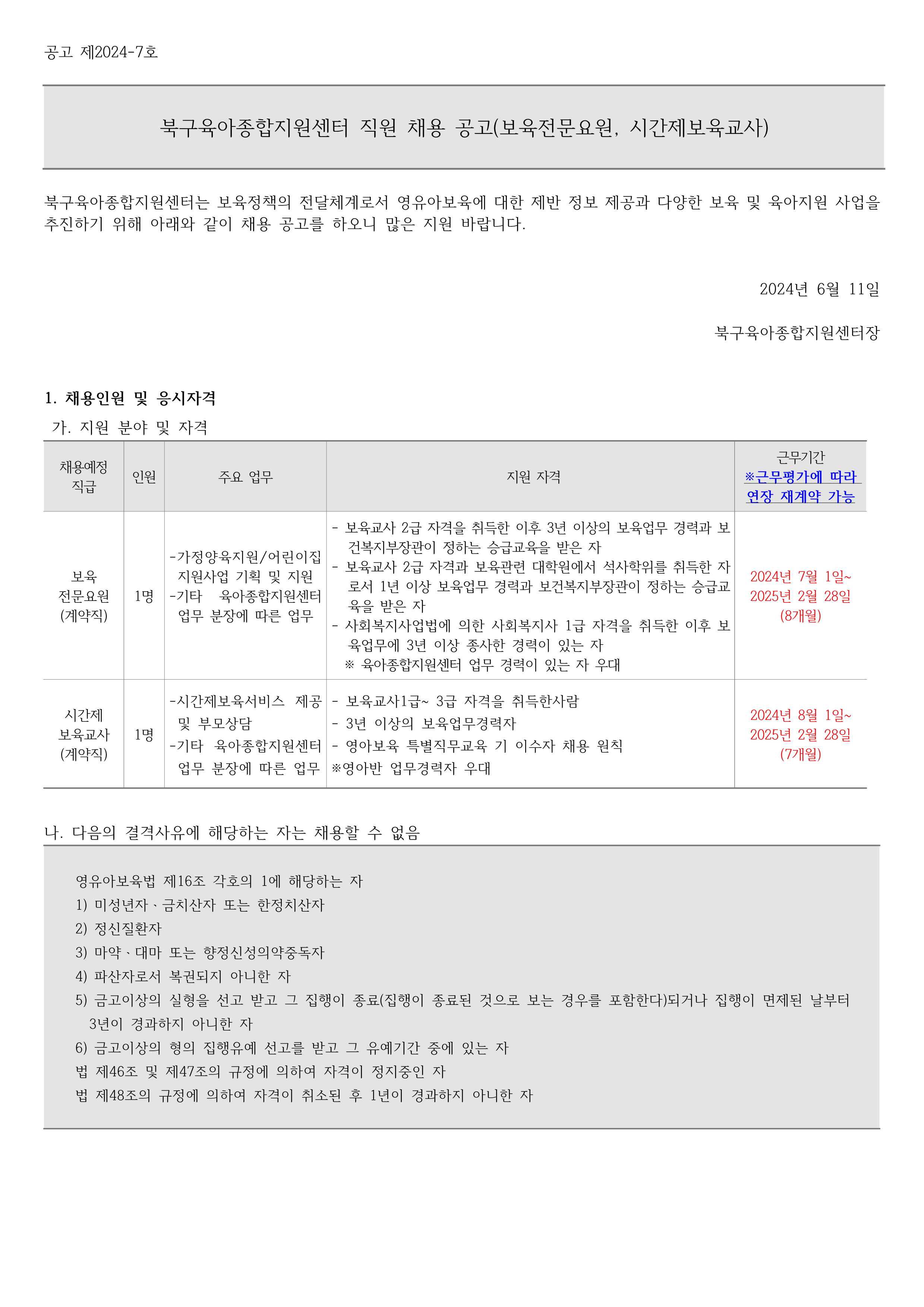 [북구육종합지원센터] 직원 채용 공고(보육전문요원, 시간제보육교사)