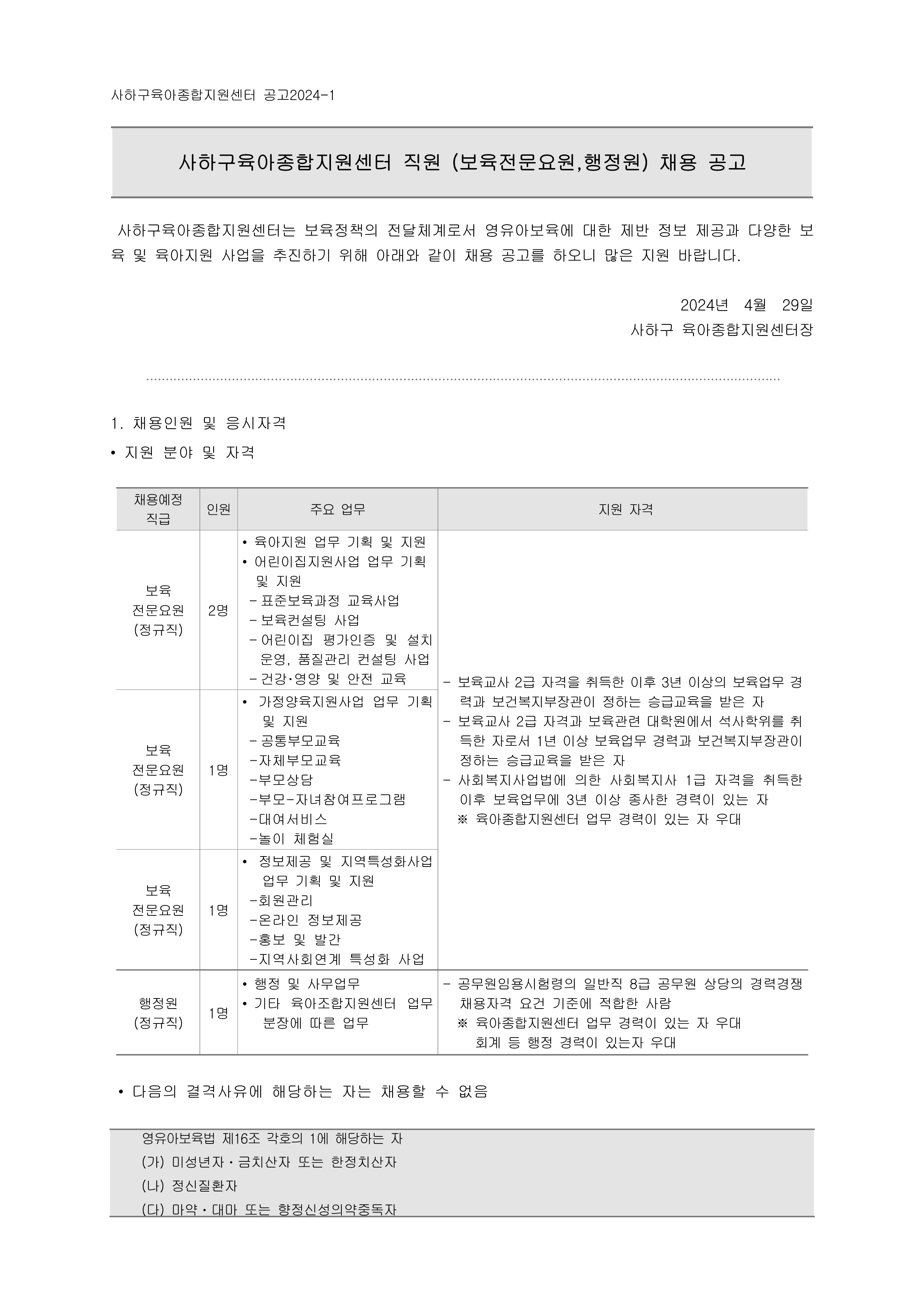 사하구육아종합지원센터 직원 (보육전문요원,행정원) 채용 공고