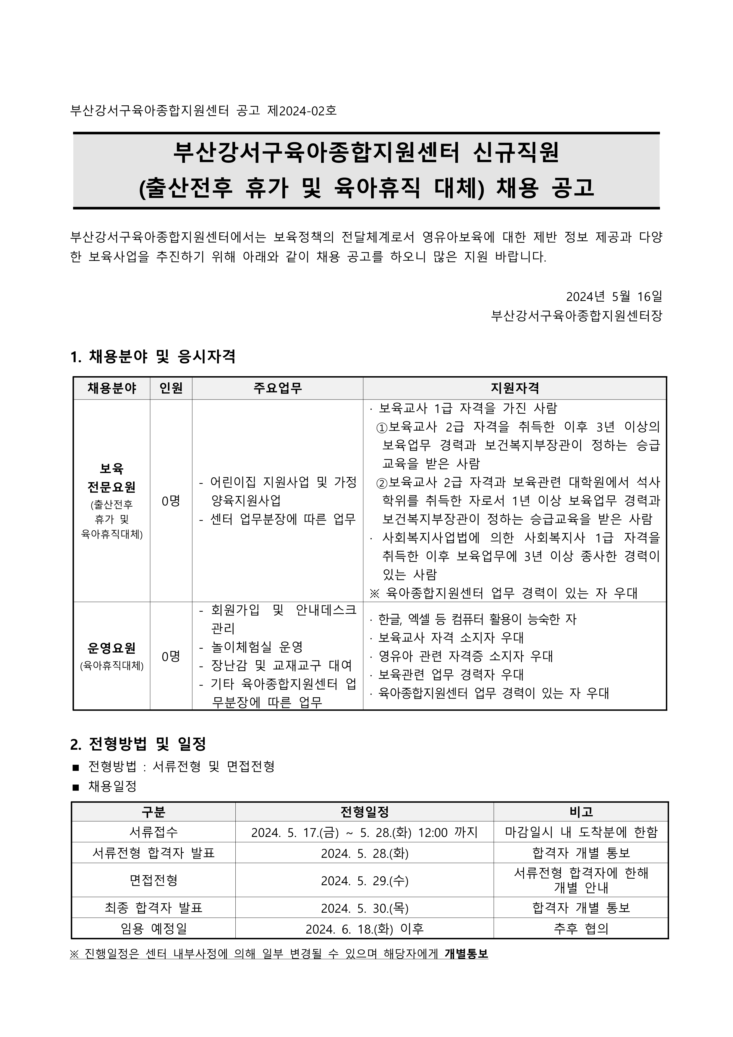 [부산광역시육아종합지원센터] 2024년 대체교사관리자(출산전후휴가 및 육아휴직 대체) 인력 채용 공고