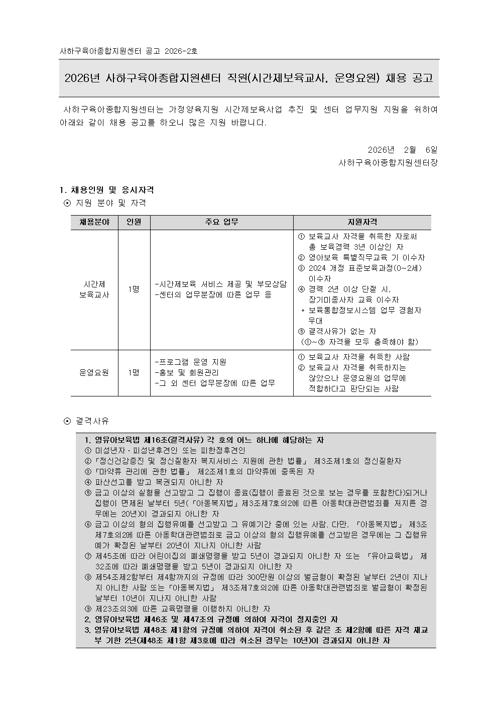 2-1. (사하구육아종합지원센터 공고 2026-2호) 사하구육아종합지원센터 직원(시간제보육교사, 운영요원) 채용 공고문.hwp