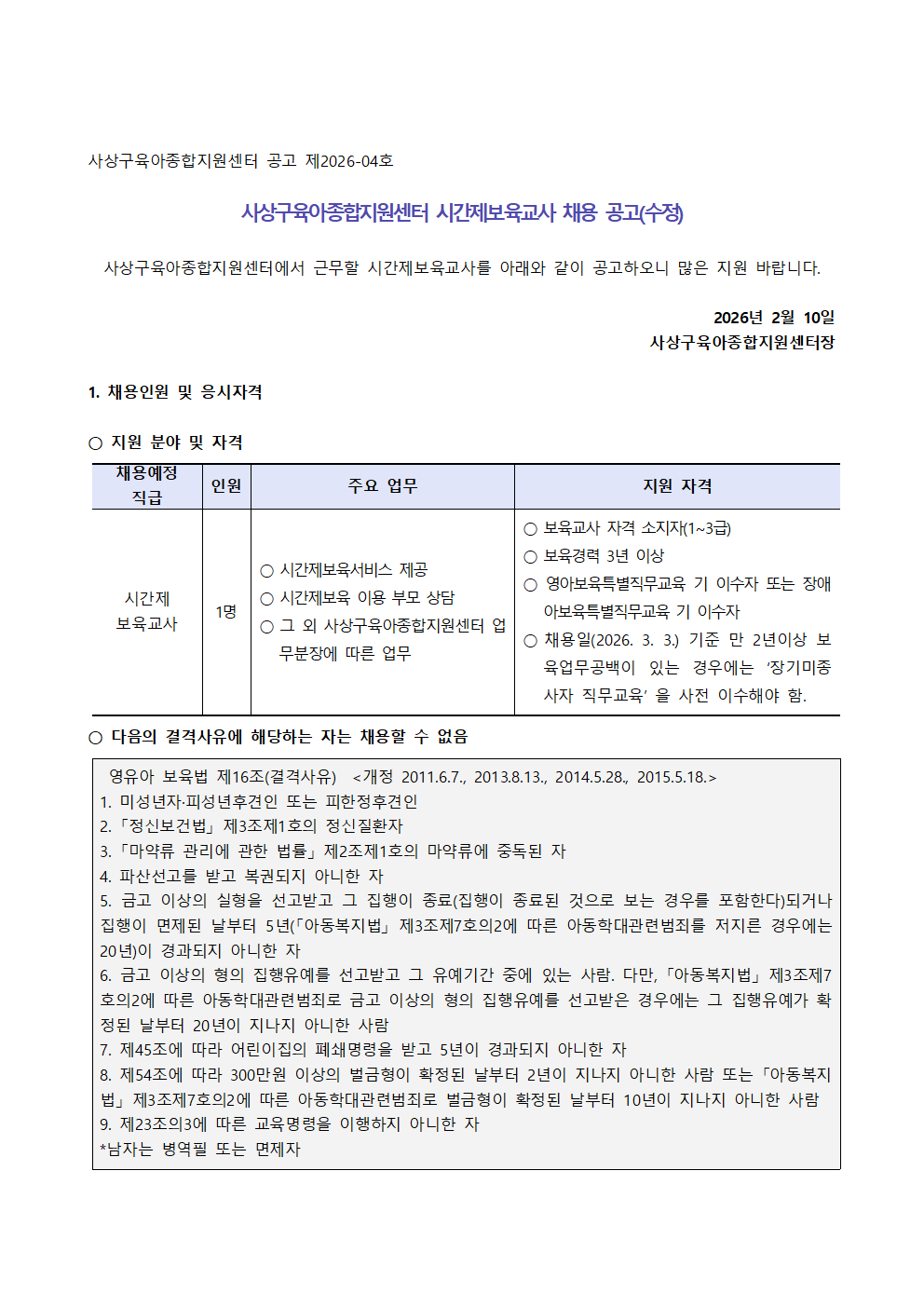 사상구육아종합지원센터 시간제보육교사 채용 공고(수정공고).hwp