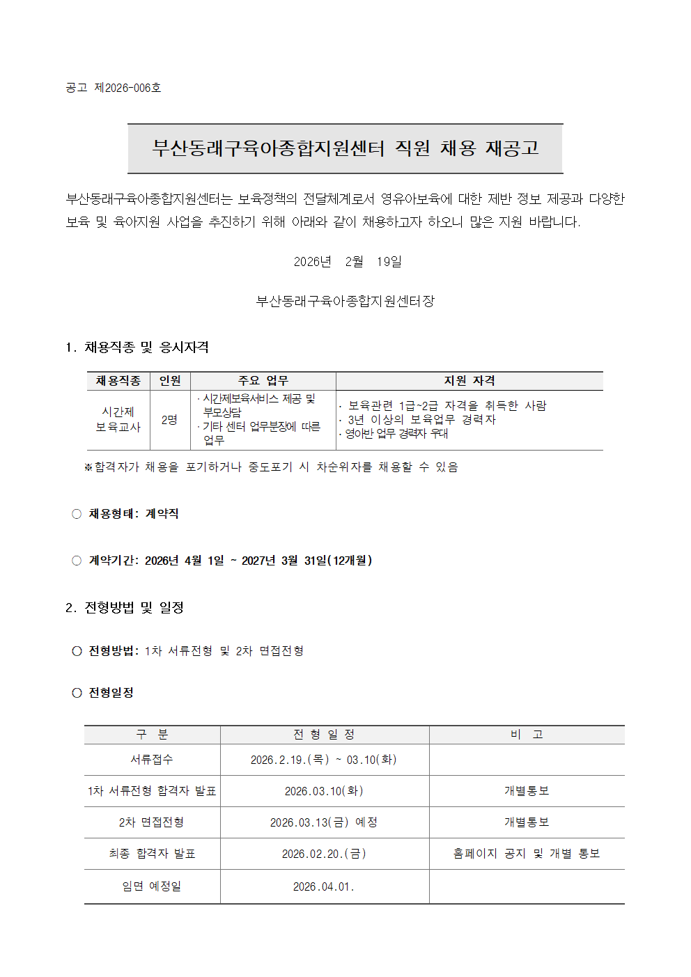 [부산동래구육아종합지원센터] 직원 채용 재공고