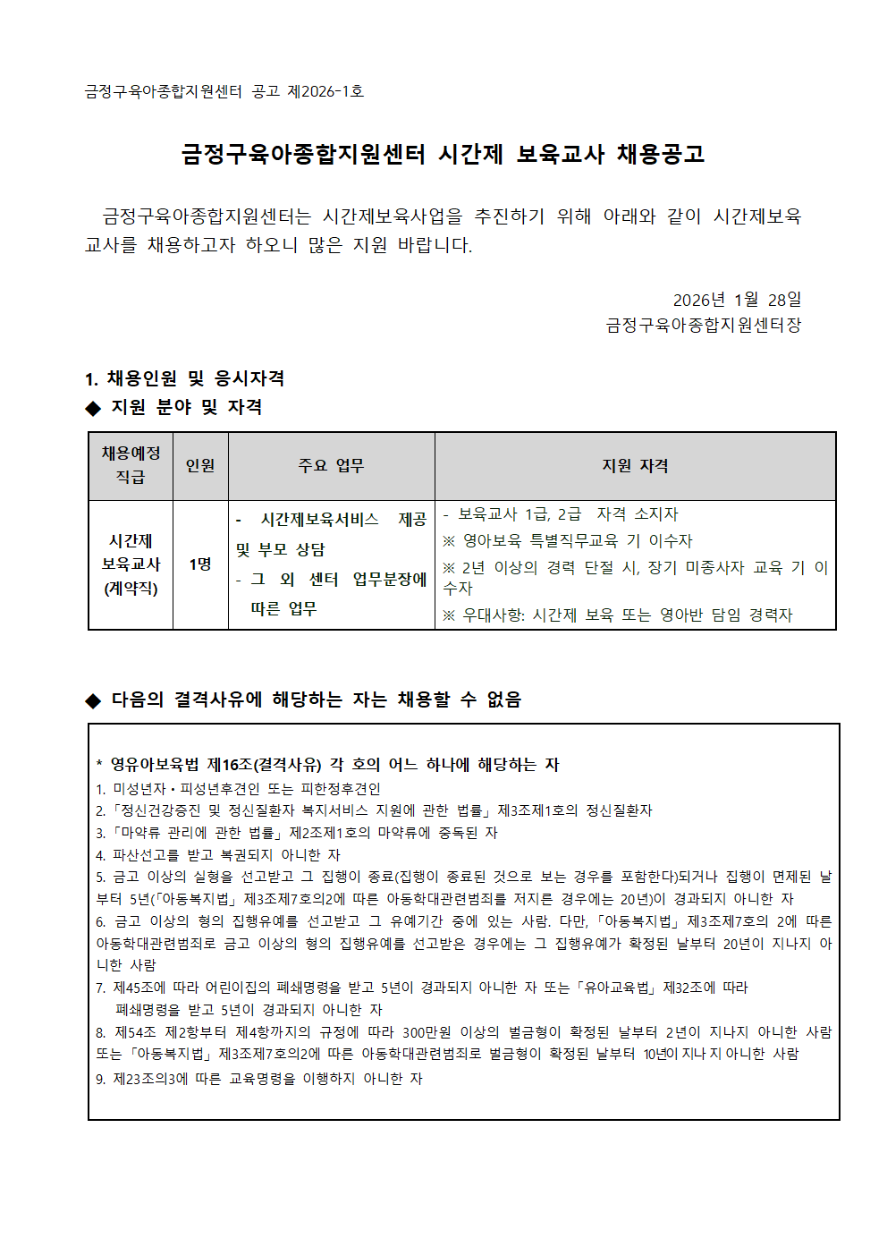 금정육종지26-014. 붙임1) 시간제 보육교사 채용 공고문.hwp