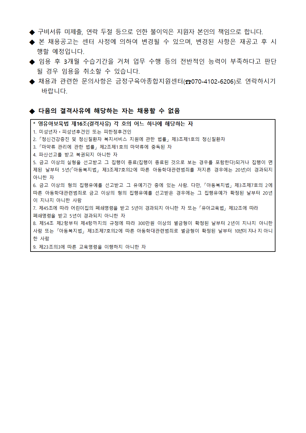 [금정구육아종합지원센터] 보육전문요원(육아휴직대체) 채용 공고
