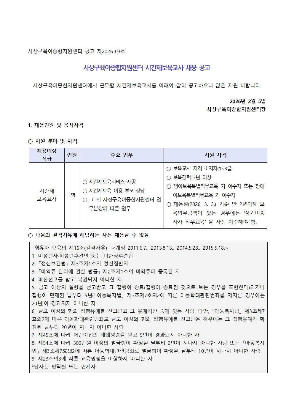 사상구육아종합지원센터 시간제보육교사 채용 공고.hwp