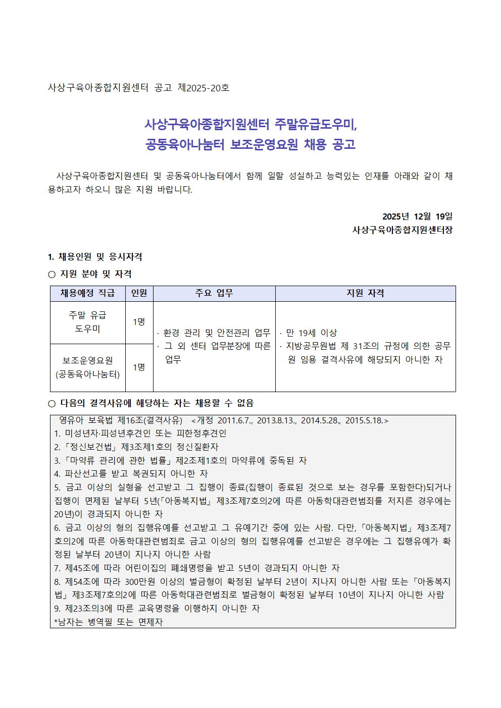 사상구육아종합지원센터 주말유급도우미, 공동육아나눔터 보조운영요원 채용 공고.hwp
