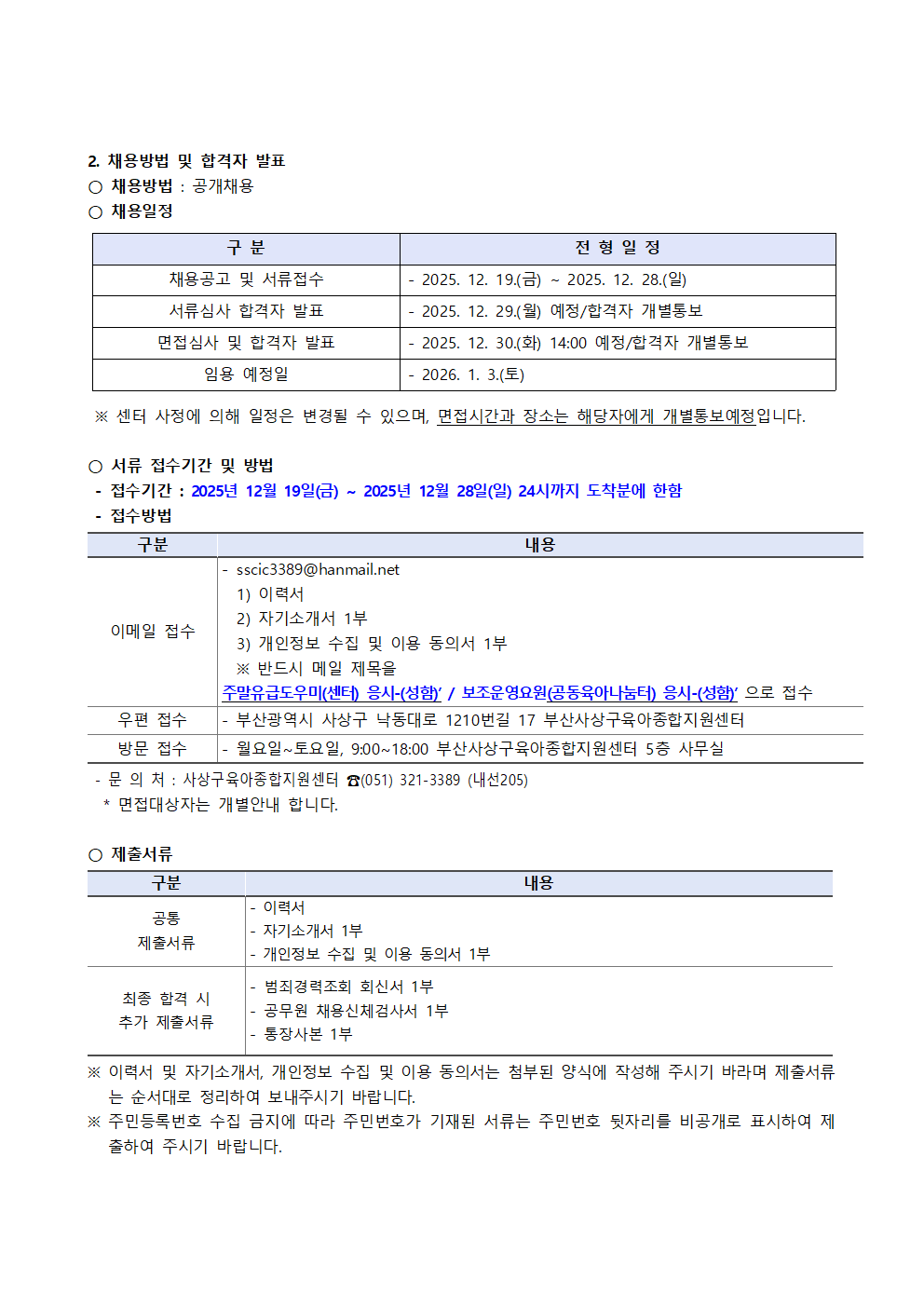 [사하구육아종합지원센터] 기간제직원 채용 공고