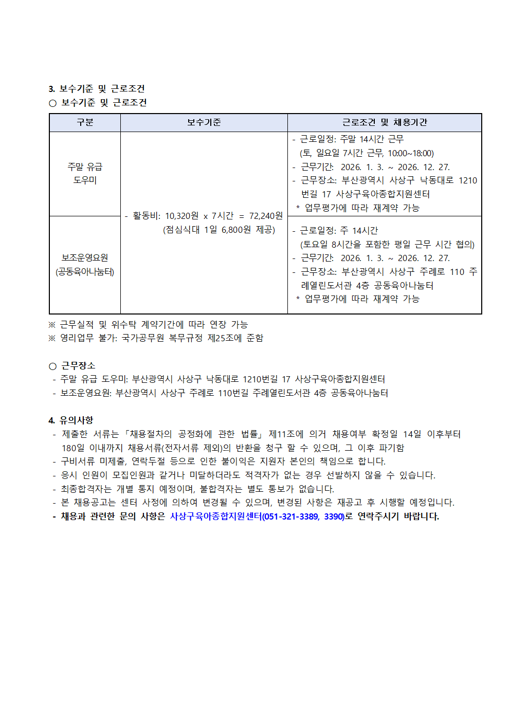 [사상구육아종합지원센터] 주말 유급 도우미, 공동육아나눔터 보조운영요원 채용 공고