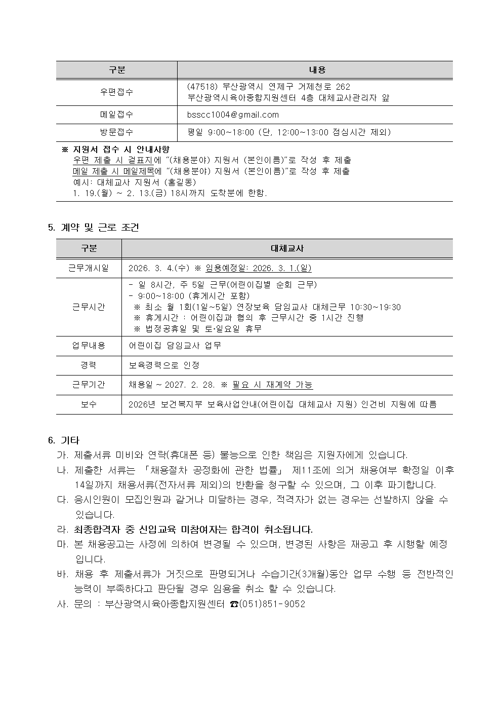 [부산광역시육아종합지원센터] 대체교사 인력 채용 공고